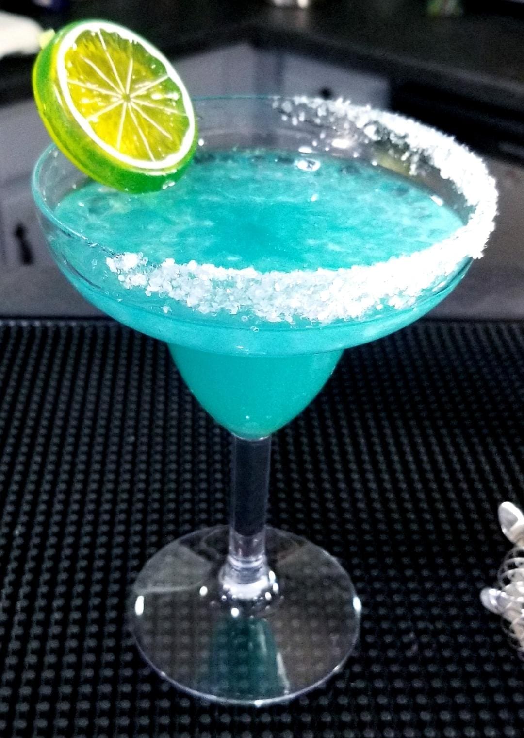 Glass is half rimmed with “salt” (rock salt mixed with white glitter). Garnished with 2 stirrers and an artificial lime.