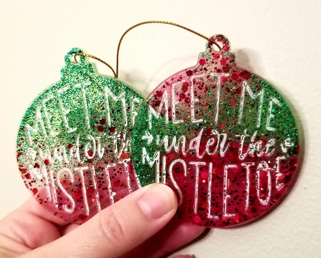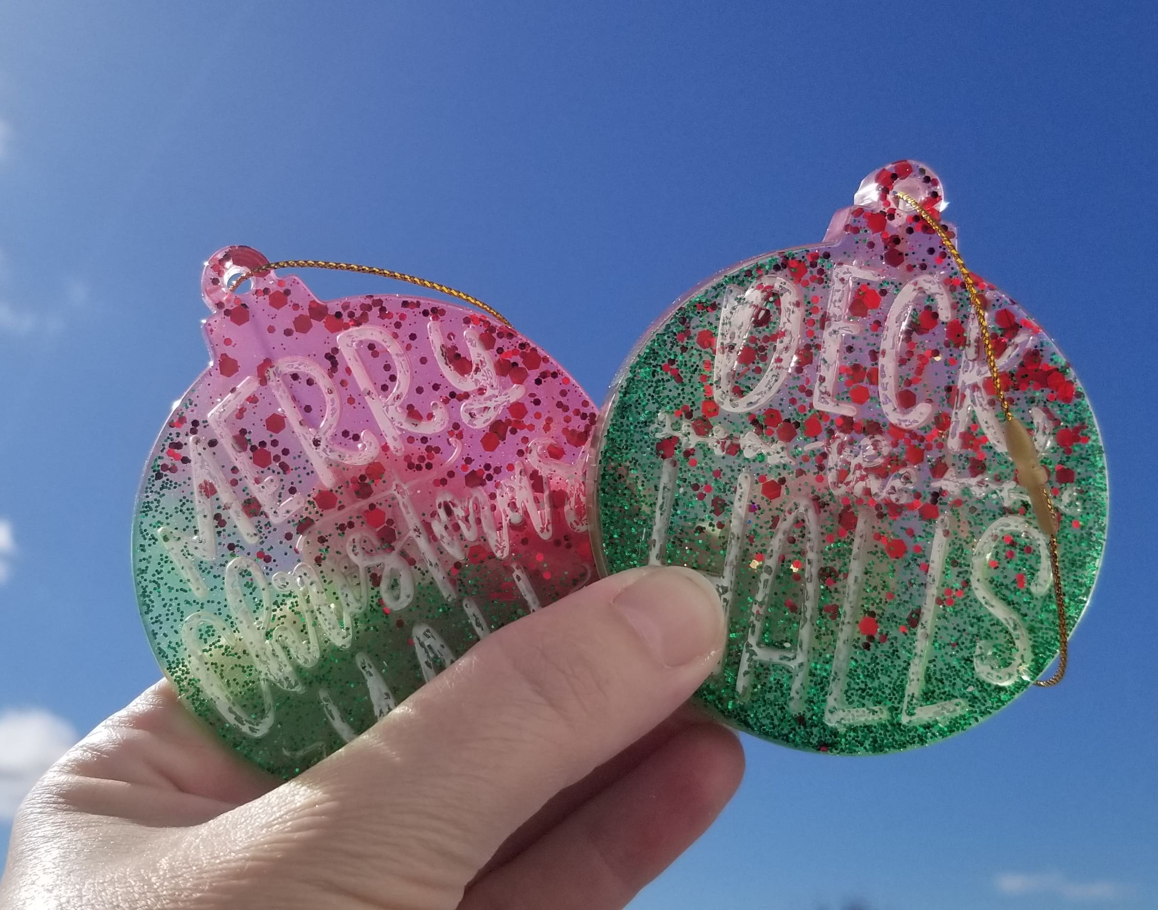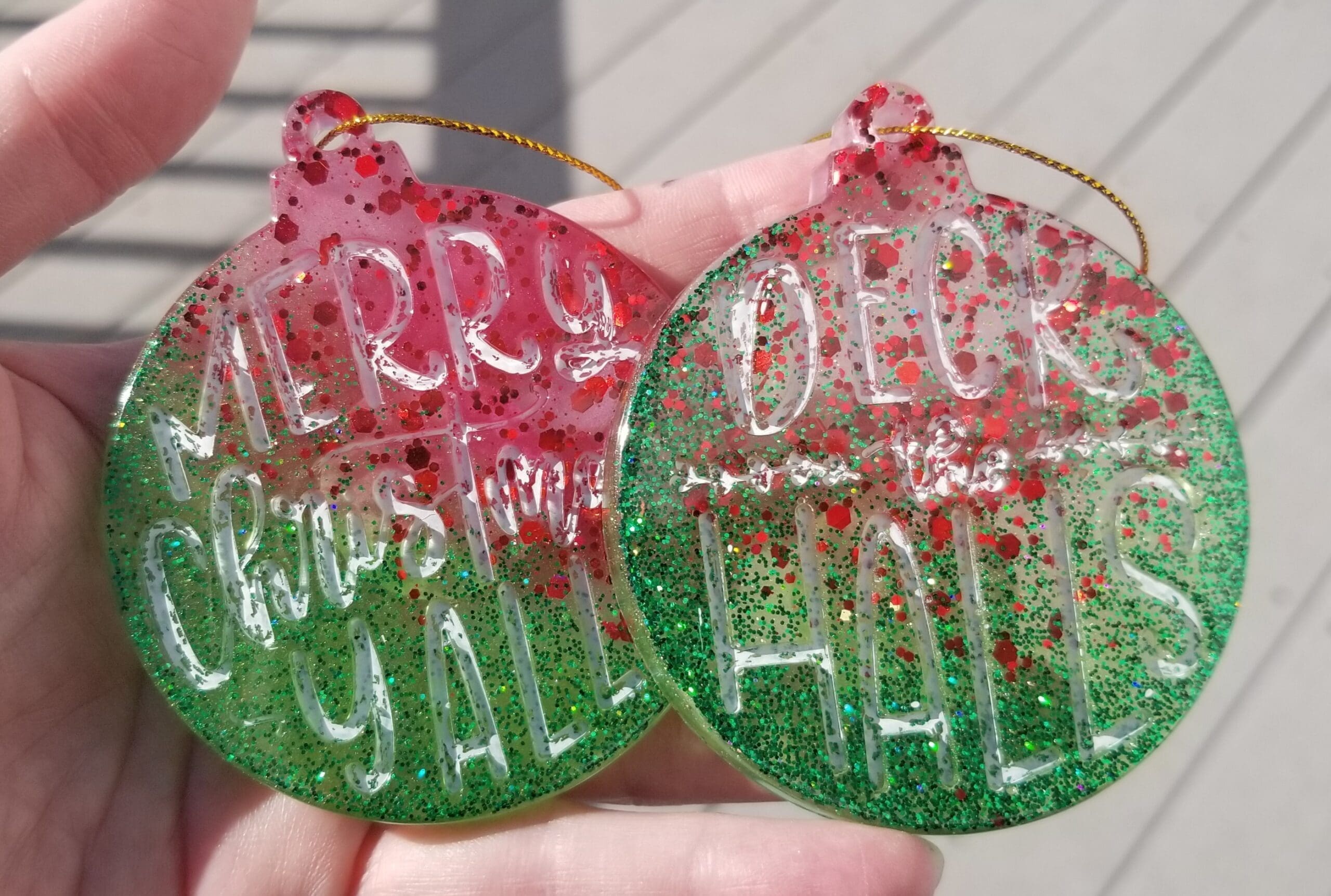 Made of a red resin and red glitter, as well as green resin with green glitter. Comes ready to hang on gold ornament string.