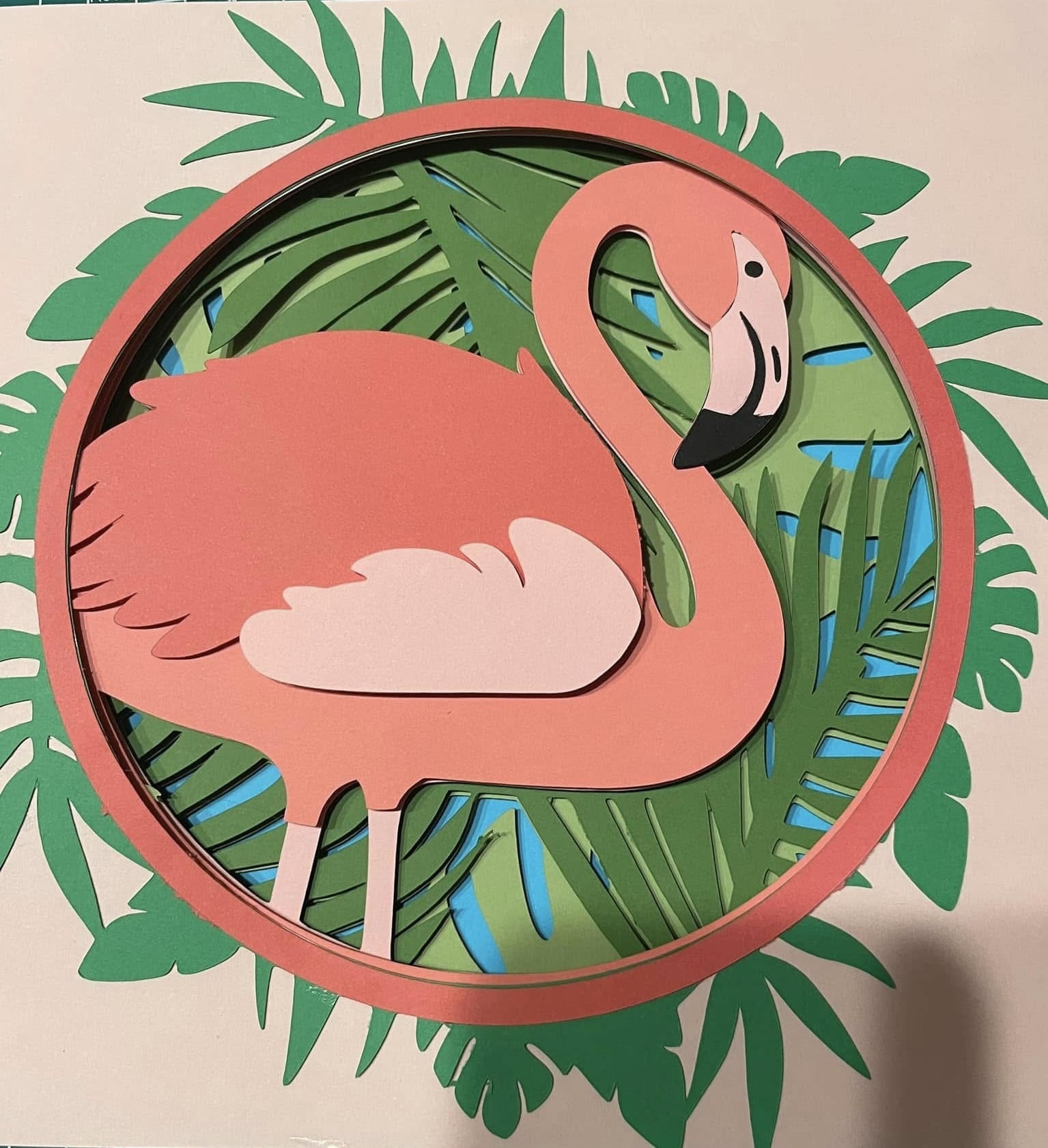 This handmade Flamingo Palm Leaf Shadow Box showcases a graceful flamingo framed by layered palm leaves, creating a striking balance of color, depth, and texture. Designed in a circular format, this flamingo shadow box draws the eye inward while maintaining a soft, natural flow that works beautifully in modern, coastal, and tropical interiors. The layered paper construction adds dimension, allowing subtle shadows to form and enhance the overall visual impact.