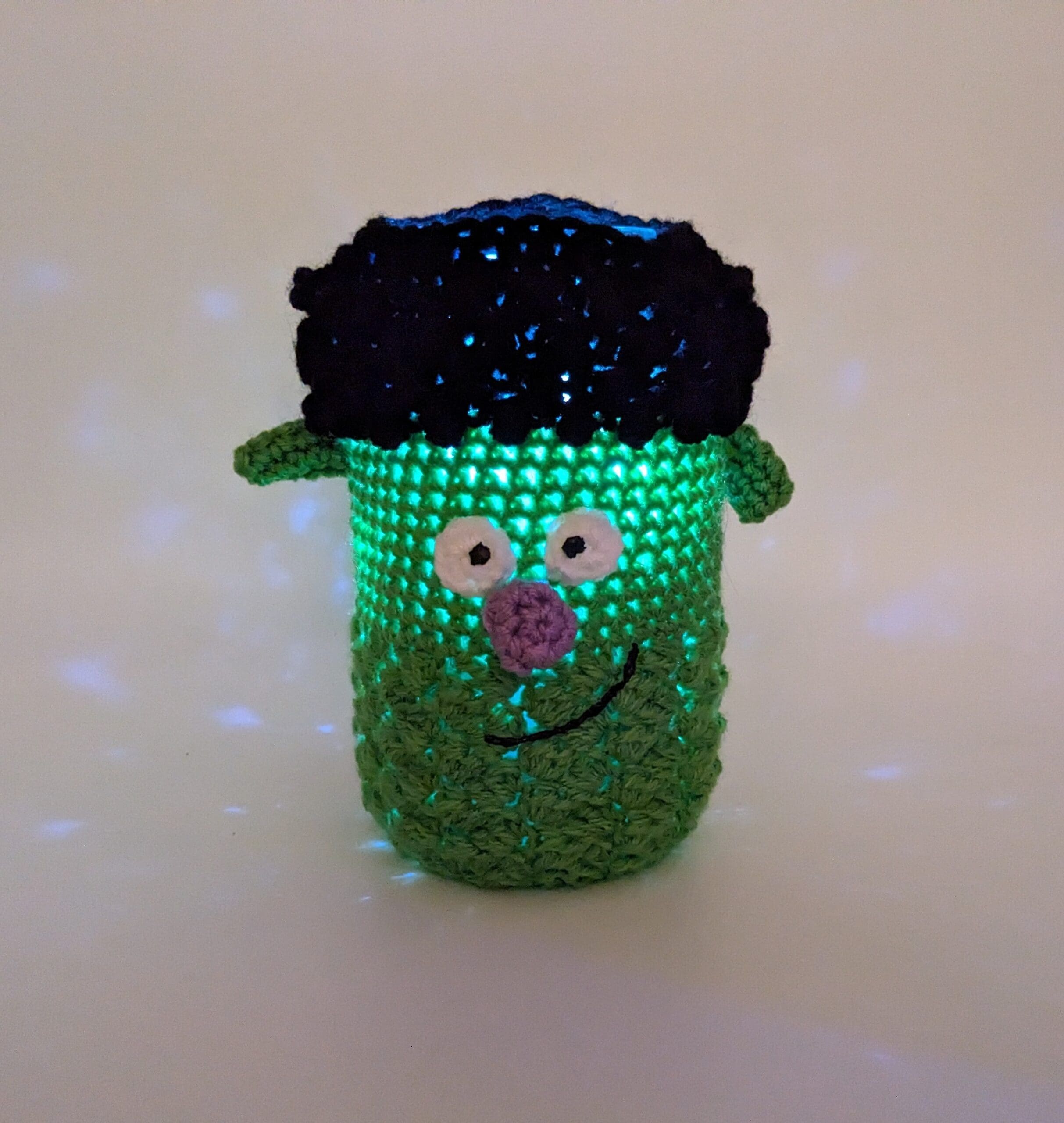 Frank Luminary Crochet Mason Jar Cover. You get this unique jar cover to cover a quart size jar (jar Not included). Also you can light your jar up with a string of LED lights to light up a window or shelf in your home. You can fill your jar with candy. Also you could fill the jar with real or artificial fall flowers. You can find a nice selection of Halloween items in my shop.