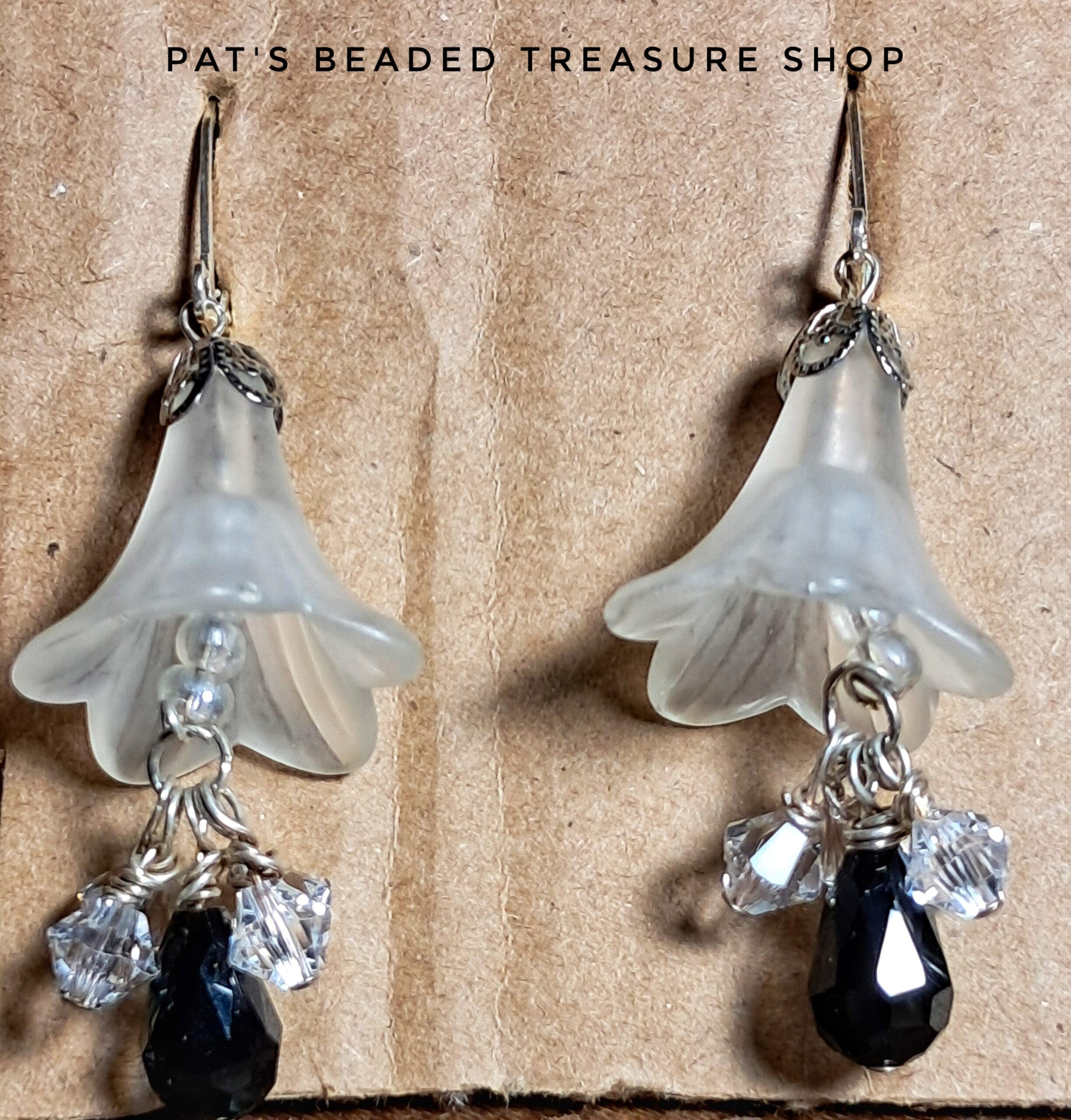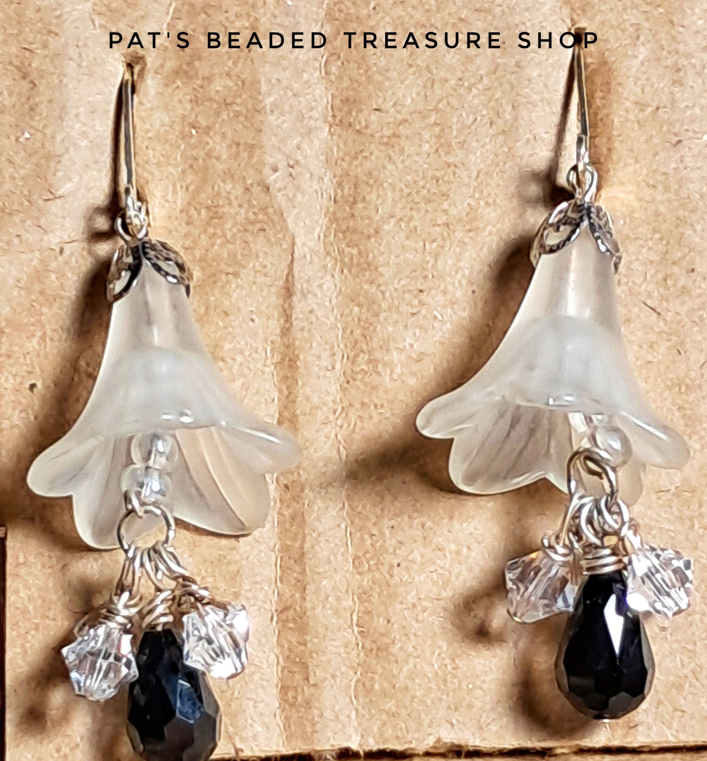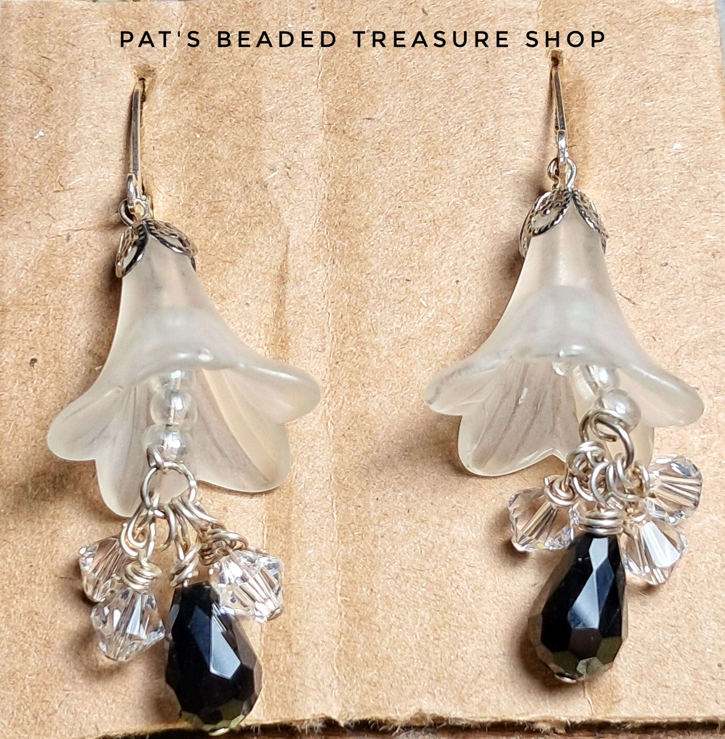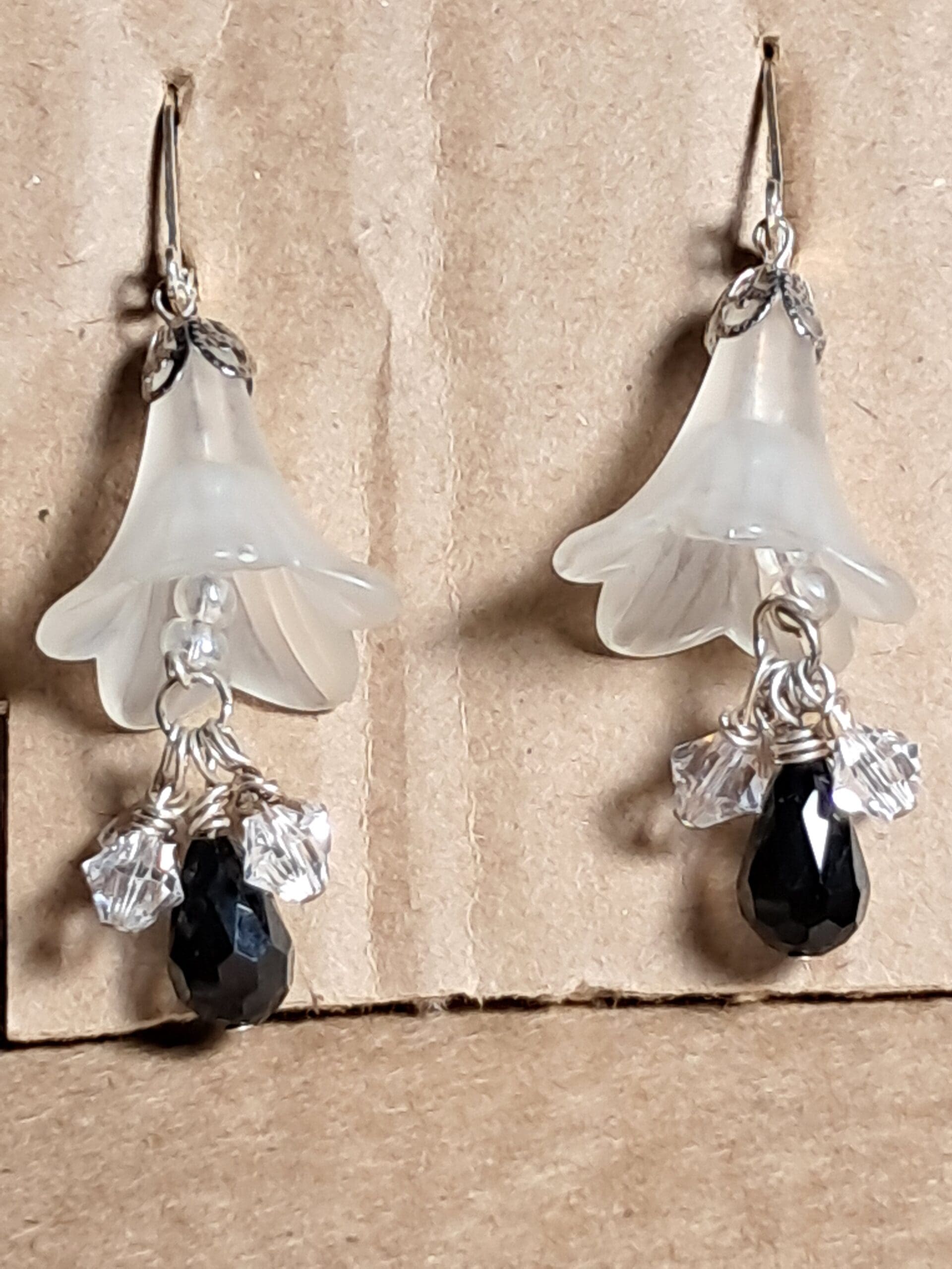 Romantic frosted lucite lilies paired with sparkling clear crystals and a faceted black teardrop accent. Finished with silver-tone leverback ear wires for secure, comfortable wear. A perfect touch of elegance for weddings, formals, or timeless everyday style.