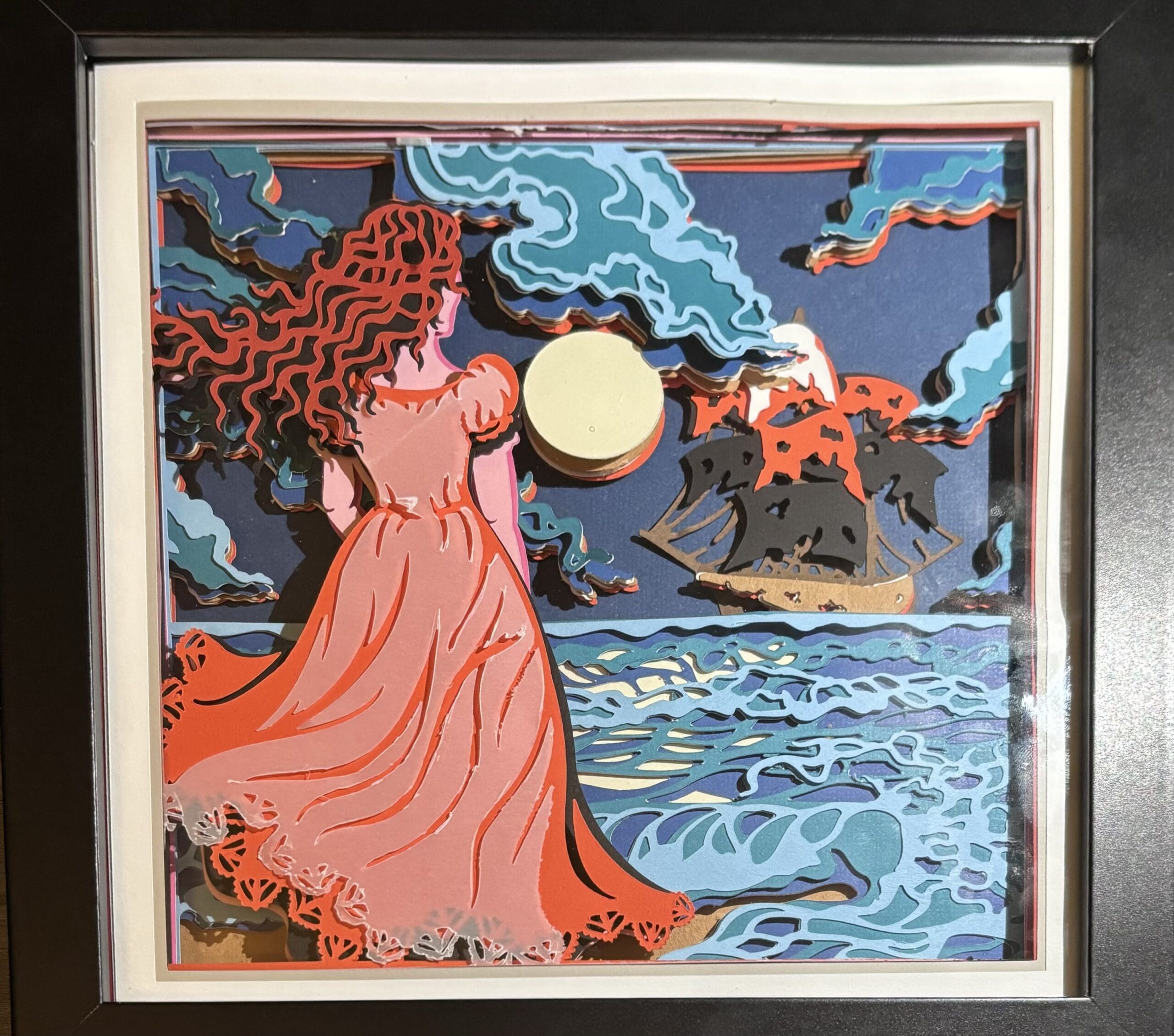This handcrafted Ghost Ship Shadow Box tells a powerful visual story through layered paper art inspired by the open sea and moonlit horizons. Featuring a flowing figure gazing across rolling ocean waves toward a distant ghost ship, this shadow box creates depth and motion through carefully stacked layers and bold color contrast. The layered design draws the eye from foreground to background, creating an immersive scene that feels alive from every angle.