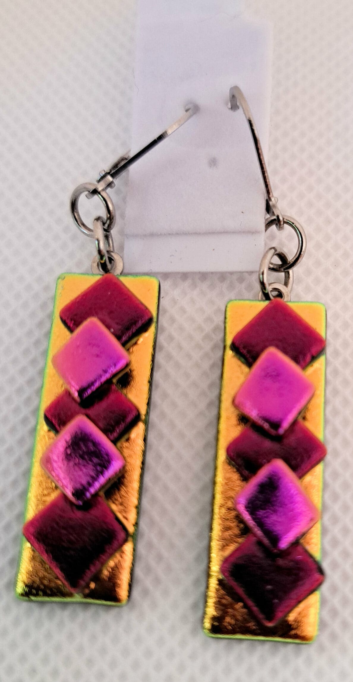 Colorful and shimmery orange, dark purple and teal fused earrings measure 2-1/2″ long from the sterling silver lever backs.
