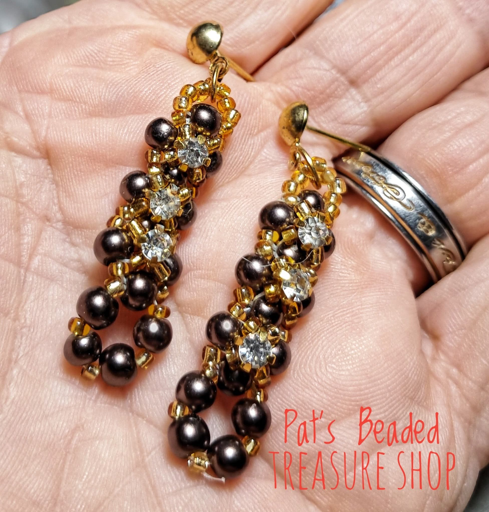 Handmade with rich chocolate brown glass pearls, shimmering gold seed beads, and sparkling clear montee accents, these earrings bring a perfect balance of elegance and sparkle. The golden post-style ear wires add a touch of sophistication, making them comfortable and stylish for any occasion.