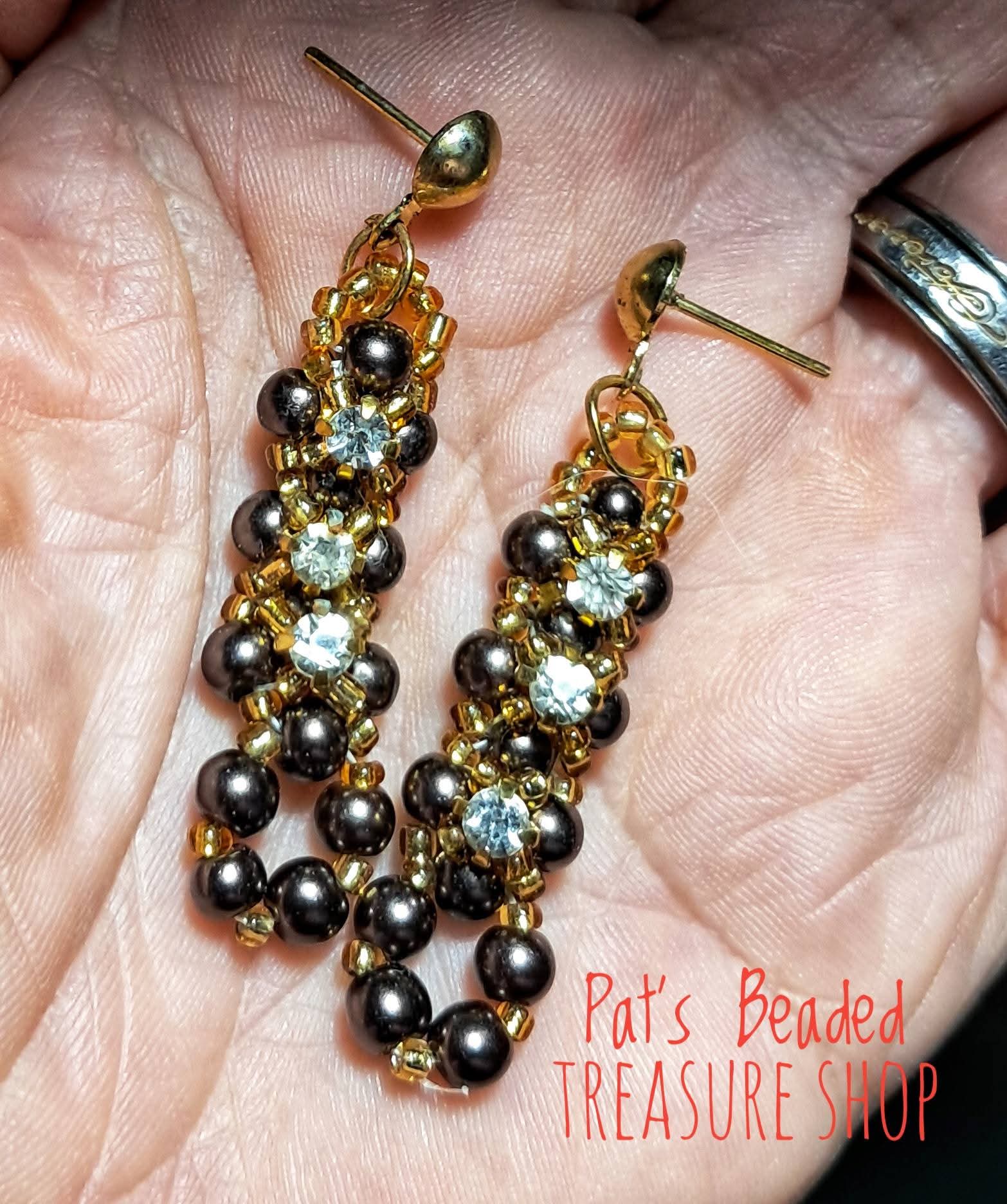 Handmade chocolate brown glass pearl dangle earrings with golden posts and shimmering crystal accents. Lightweight, elegant, and perfect for day or night. 🌙✨