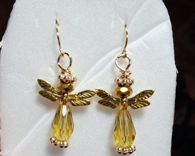 These handcrafted earrings feature shimmering golden crystal beads and delicate metal wings, creating a radiant angel design. Each pair is finished with gold-plated ear wires for comfort and shine. Lightweight and elegant, they make a lovely holiday gift, guardian angel keepsake, or everyday reminder of hope and light.