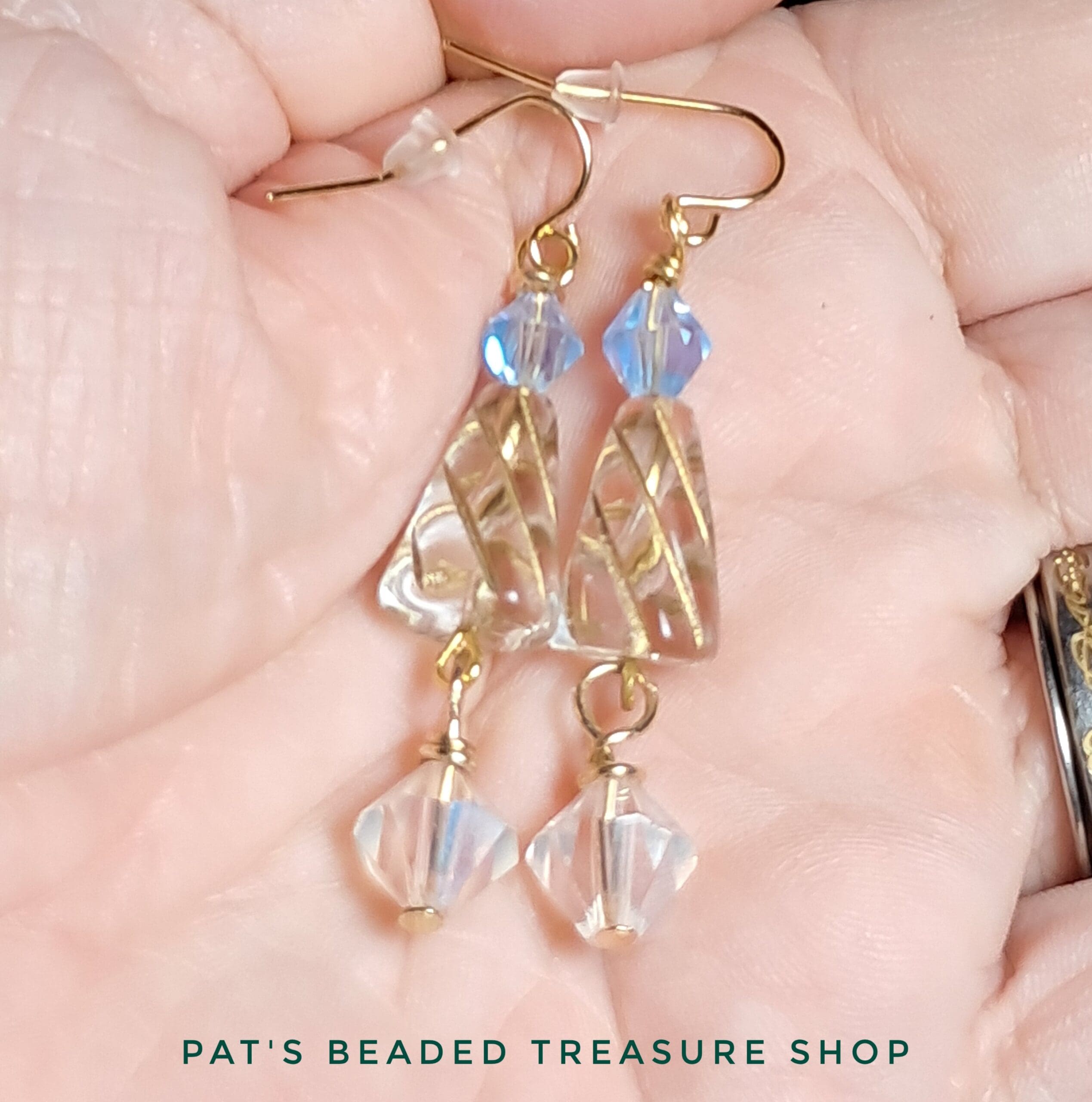 These sparkling handcrafted earrings feature clear faceted glass beads paired with golden wire-swirled trapezoid glass beads, creating a timeless and graceful design. A soft hint of blue from the accent beads adds a subtle pop of color and sophistication. The lightweight dangle style makes them ideal for both casual wear and special occasions, adding just the right amount of shimmer and movement.