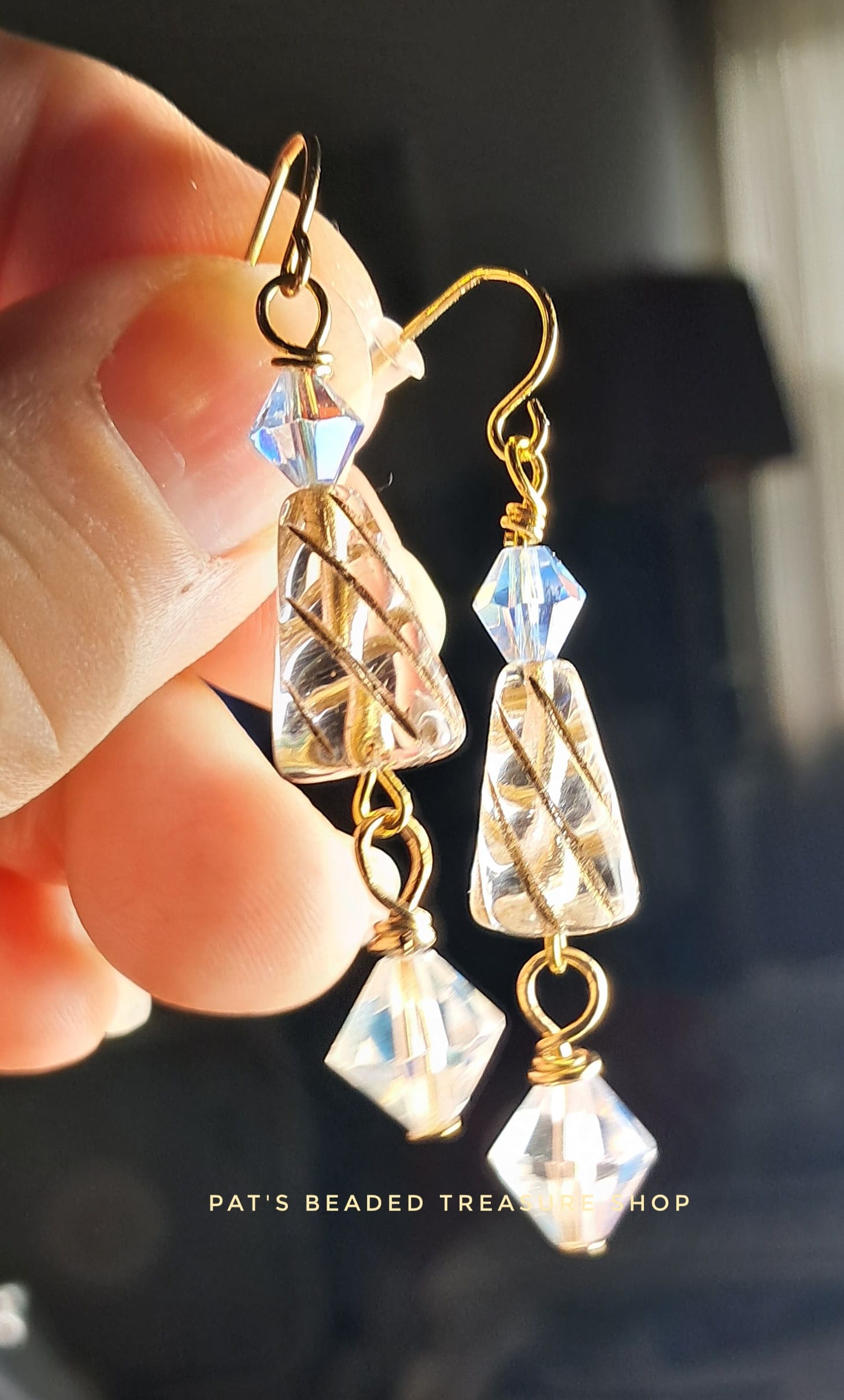 Elegant handmade dangle earrings featuring faceted glass beads and golden swirled accents. Light-catching and graceful — perfect for dressing up any outfit.
