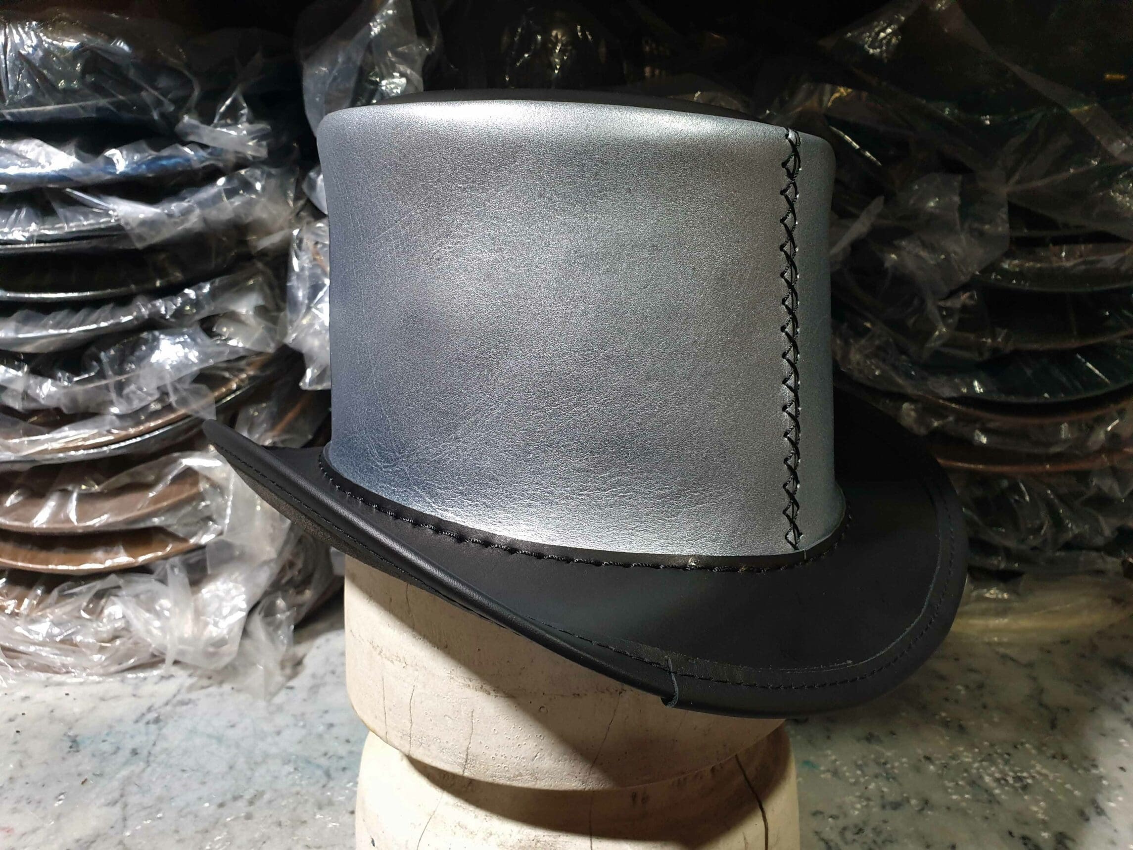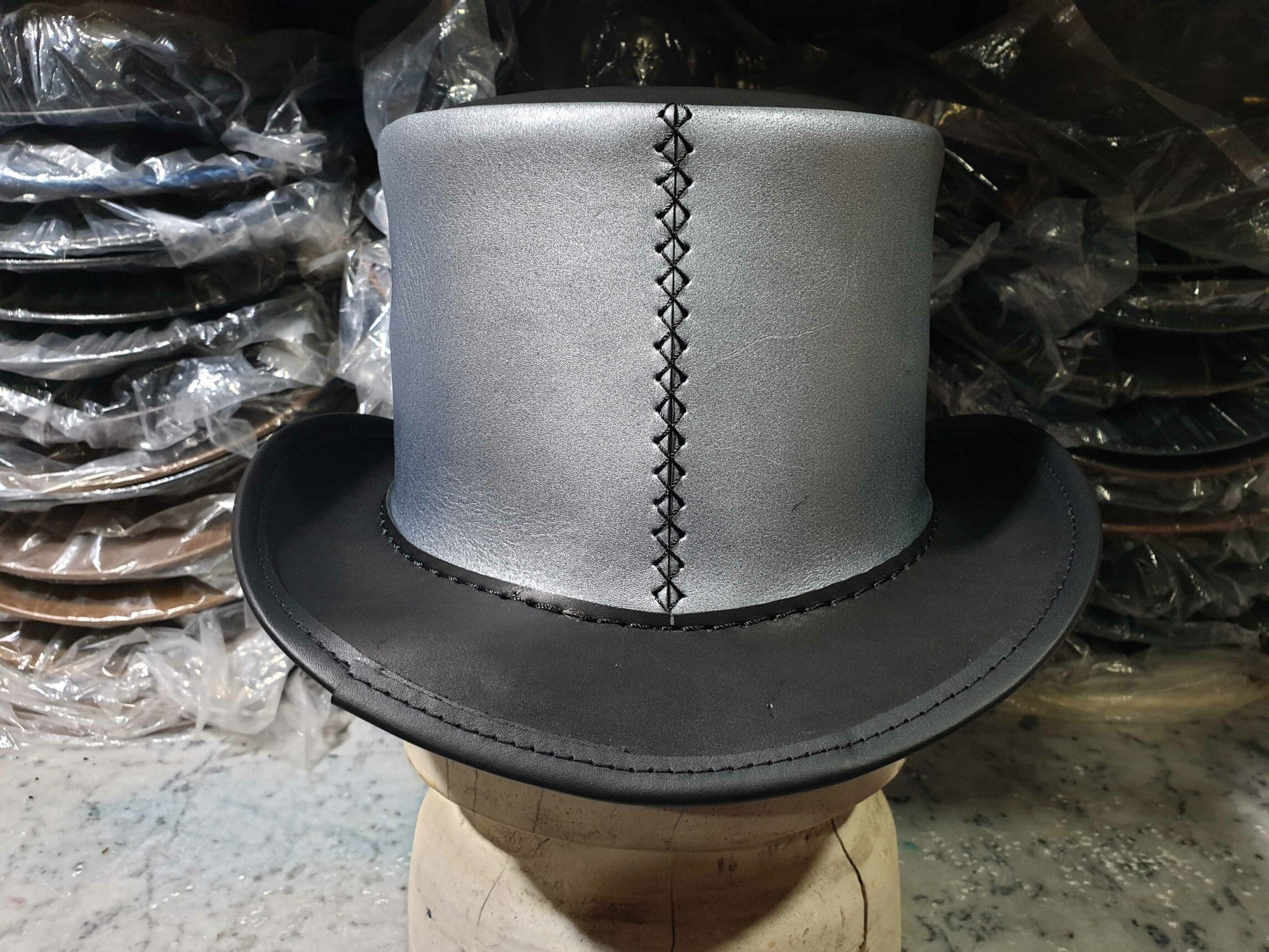 At its core, this top hat boasts premium black leather, exuding a sense of timeless elegance and durability.
