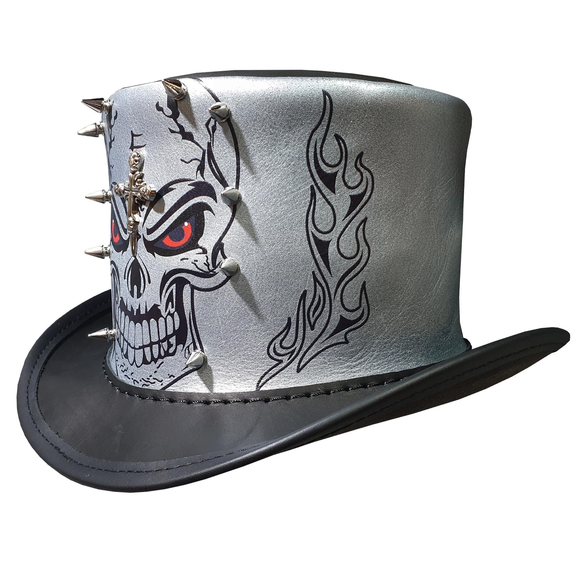 Introducing the epitome of edgy sophistication, the Gothic Red Eye Skull Mens Black Leather Top Hat