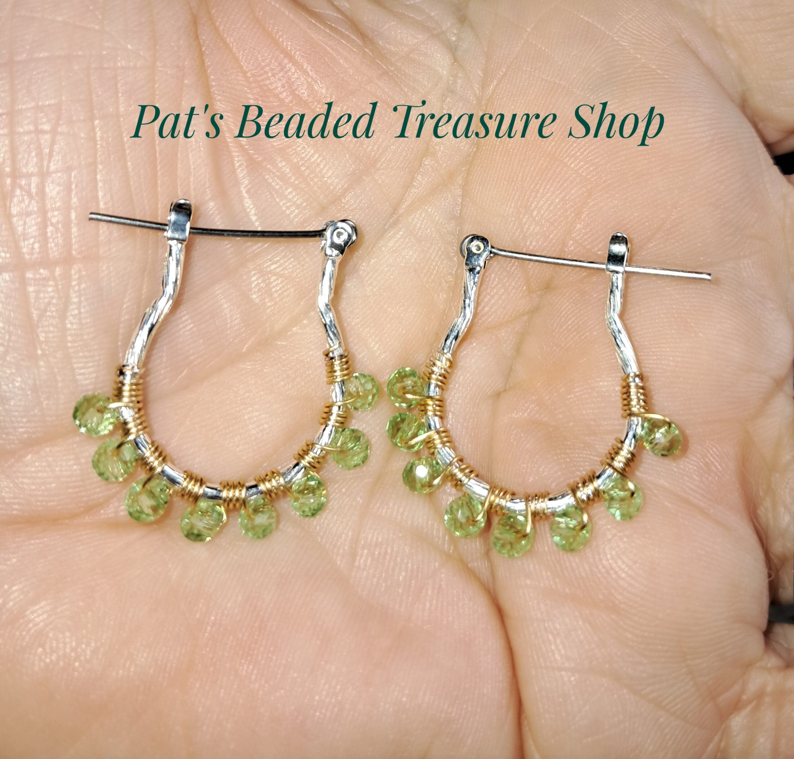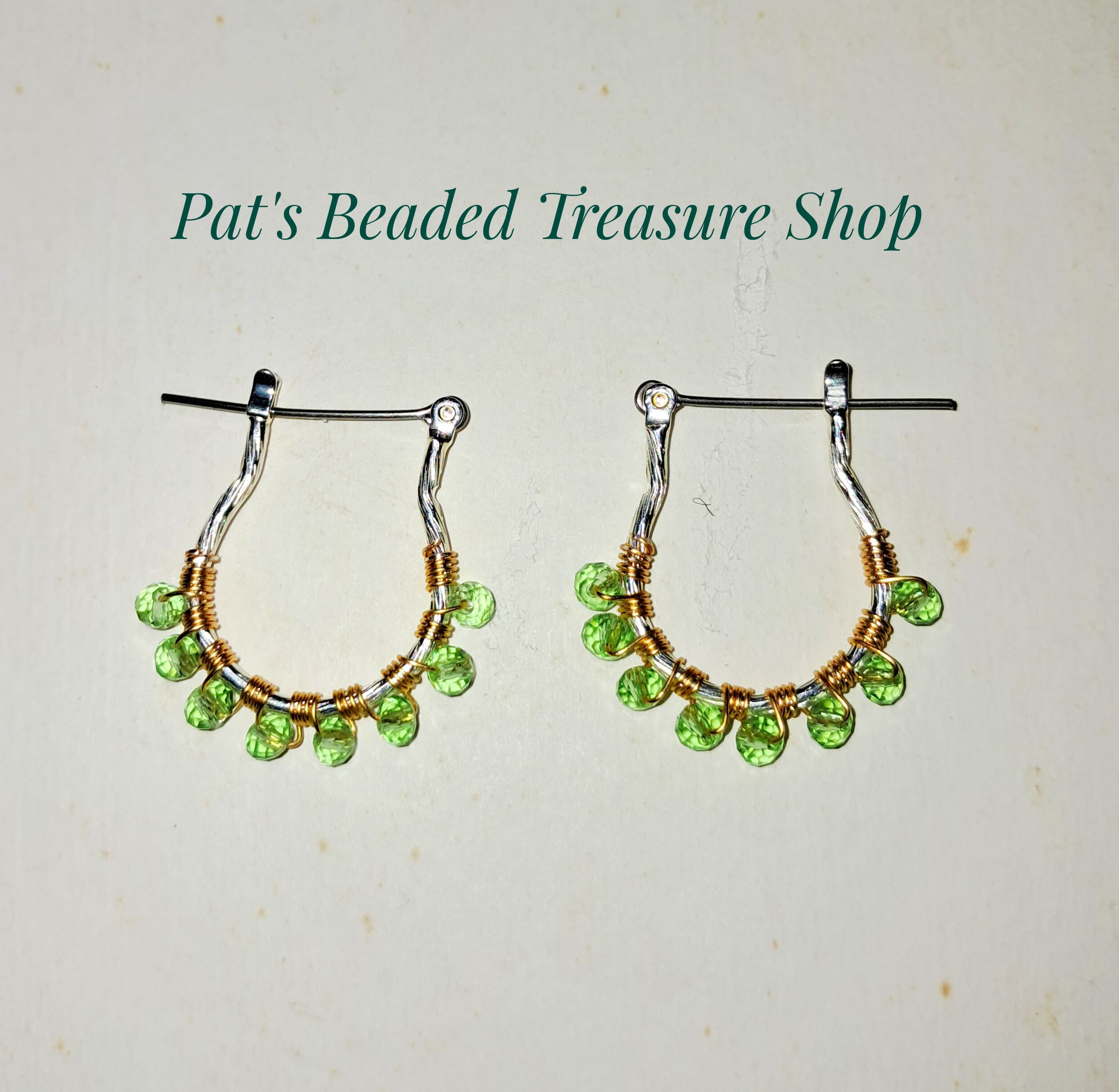 A silver-tone hoop frame is carefully wrapped in warm gold wire, securing sparkling green fire-polished beads that catch the light with every movement. The layered metal tones create beautiful contrast, making these earrings versatile enough to pair with both silver and gold jewelry.
