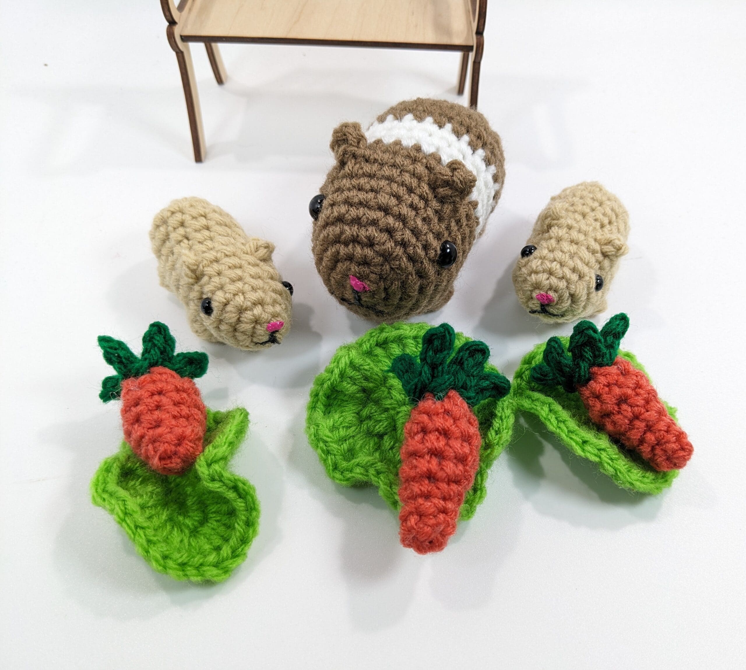 Guinea Pig Family Crochet Play Set. You get Mama Guinea Pig and her two piglets. Also, they each come with a piece of lettuce and a carrot. Every child will have fun with these adorable plush crochet pets. Parents will enjoy getting a first time pet for their child, before bringing in a live pet. You can find a selection of more fun playsets in my shop.