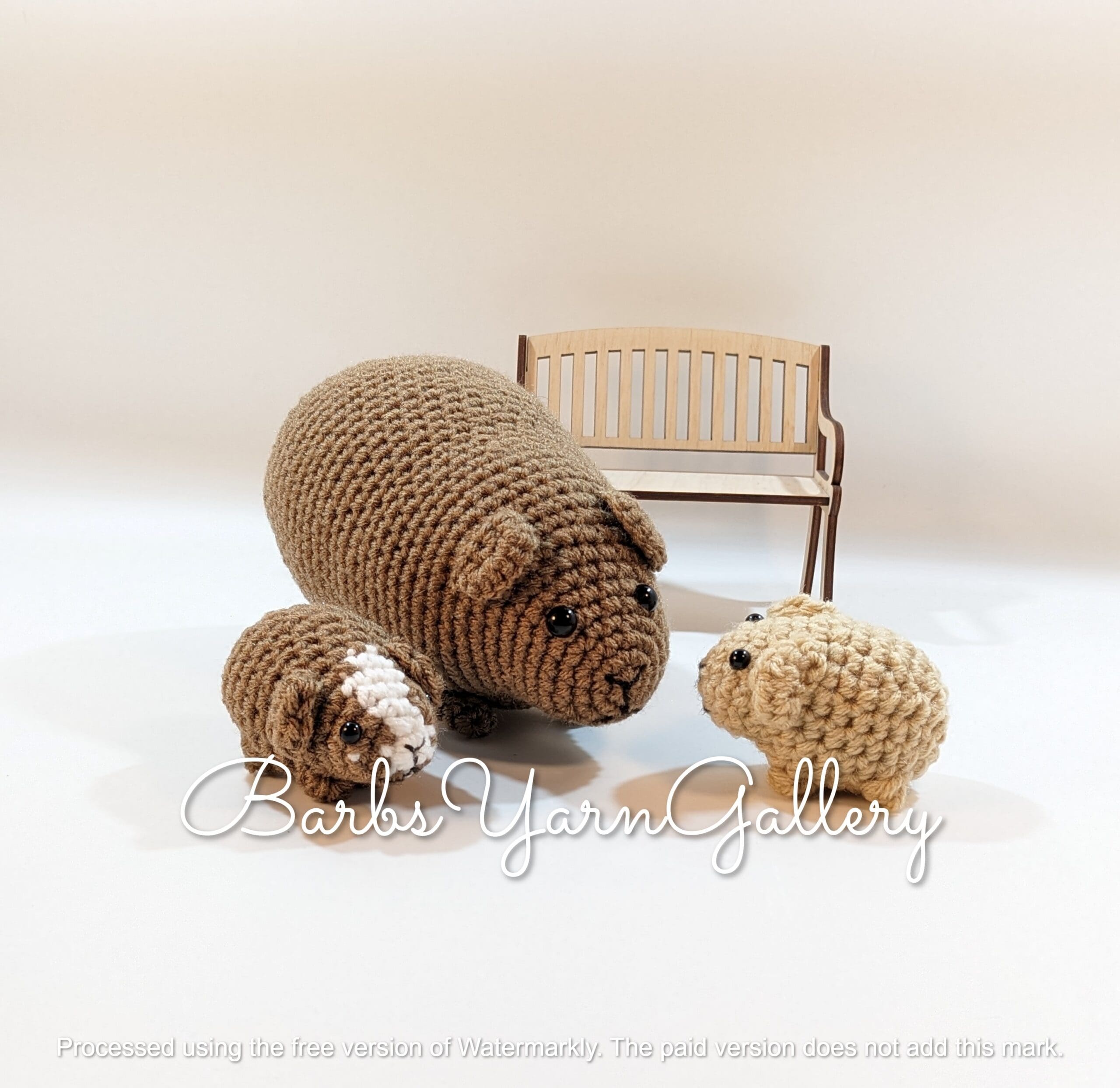 Guinea Pig Plush Crochet Toy. You get a set of three Guinea pigs, mam with two babies. Also mama Guinea pig measures 7 inches long and each baby are around 2 to 3 inches long, You can have this family of Guinea pigs made in other colors. Also you can find a selection of fun pets in my shop. You can message me to get a custom order (including having them made with embroidered eyes);