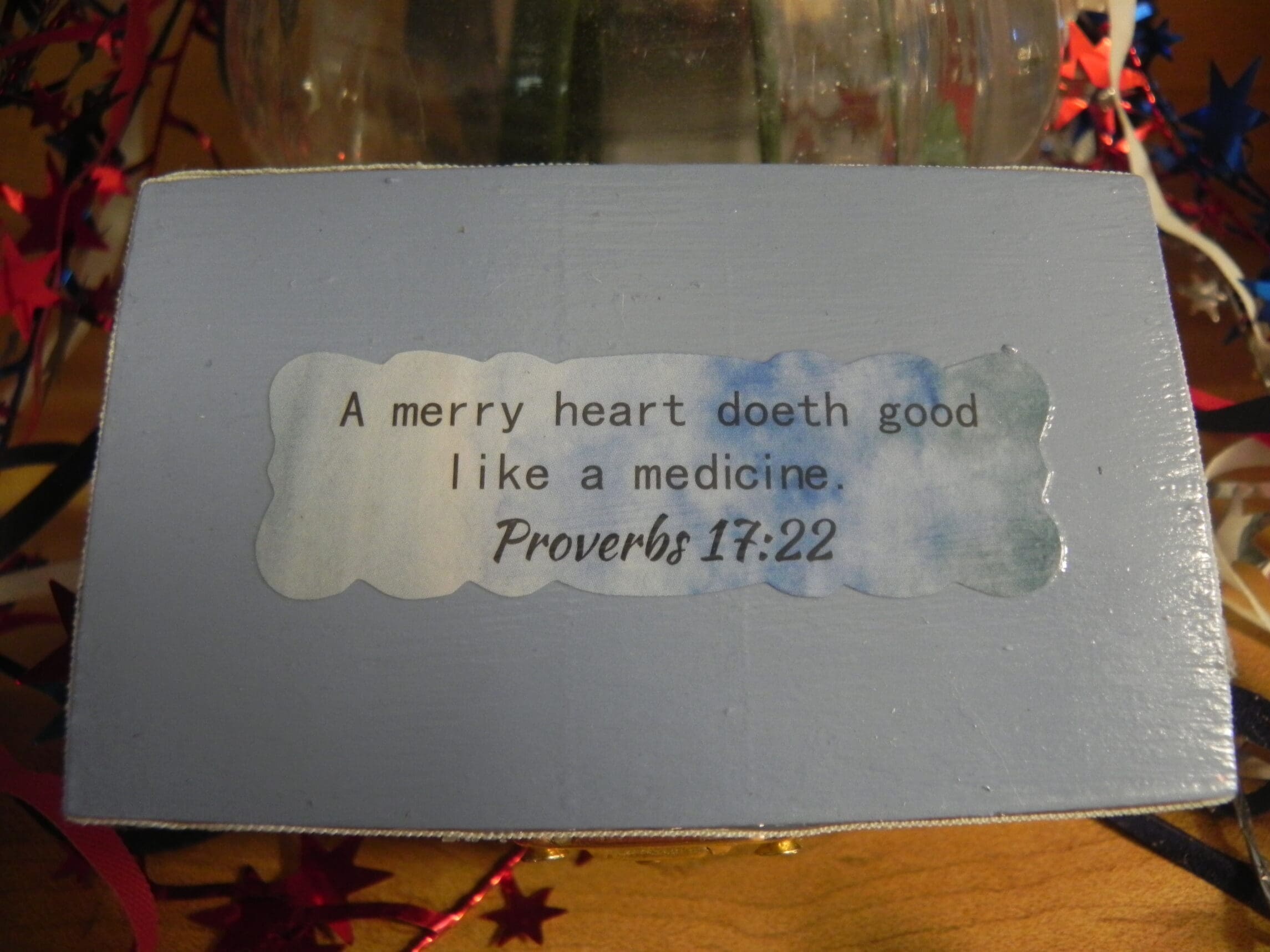 Small wooden trinket box that has been hand painted and decoupaged with a scripture: