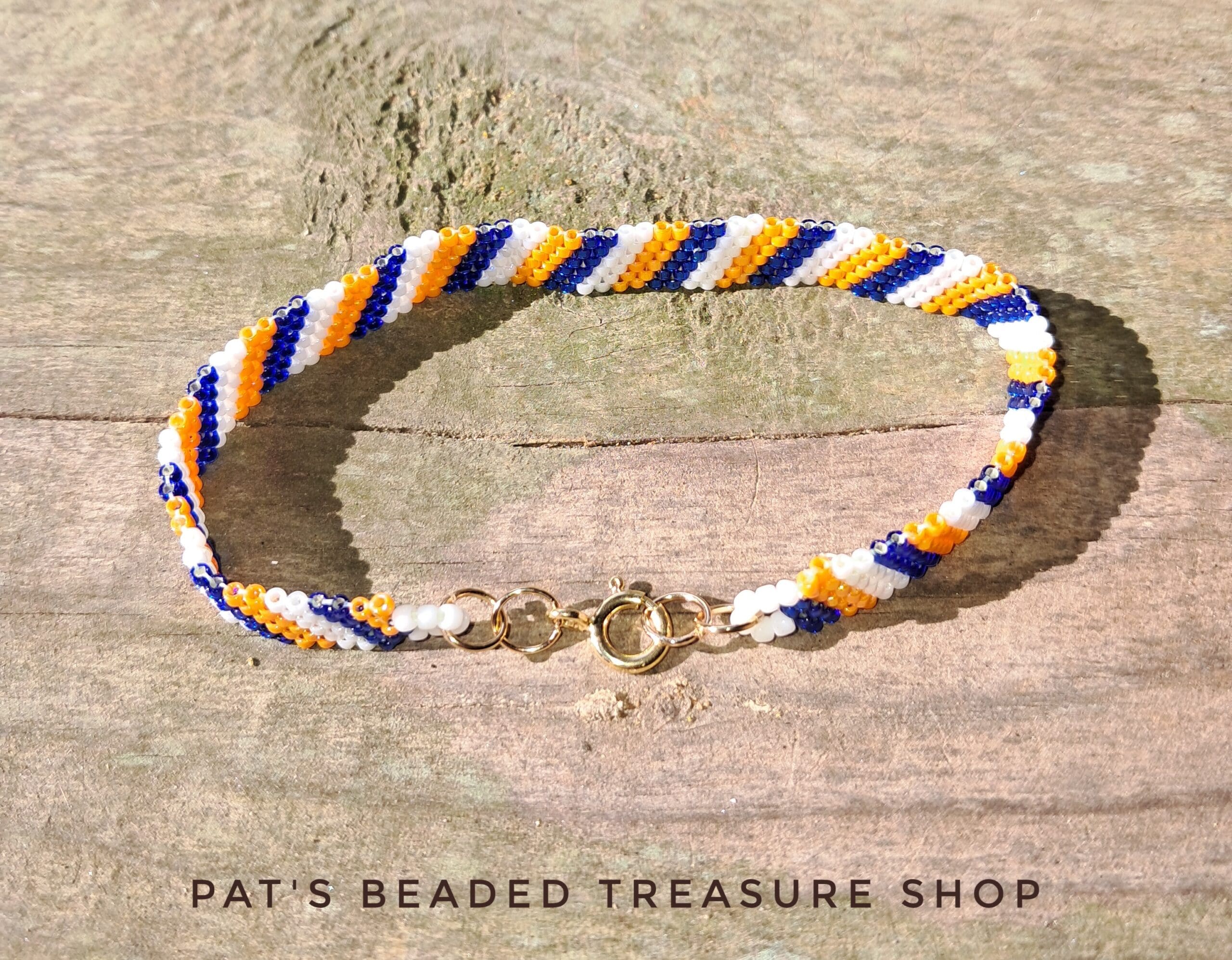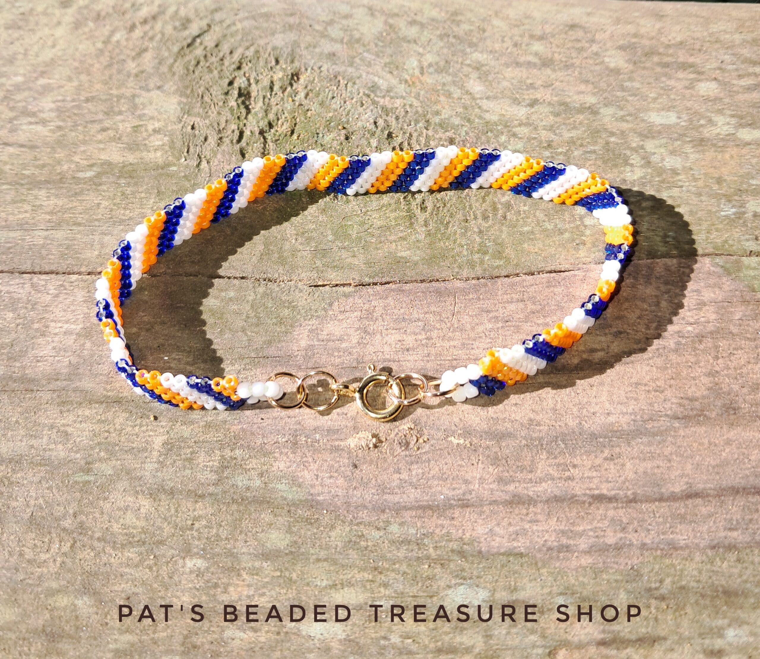 This vibrant handmade bracelet features a bold diagonal stripe pattern in rich cobalt blue, bright gold, and crisp white seed beads. Woven with care, the bracelet has a smooth and flexible feel, making it comfortable to wear daily.