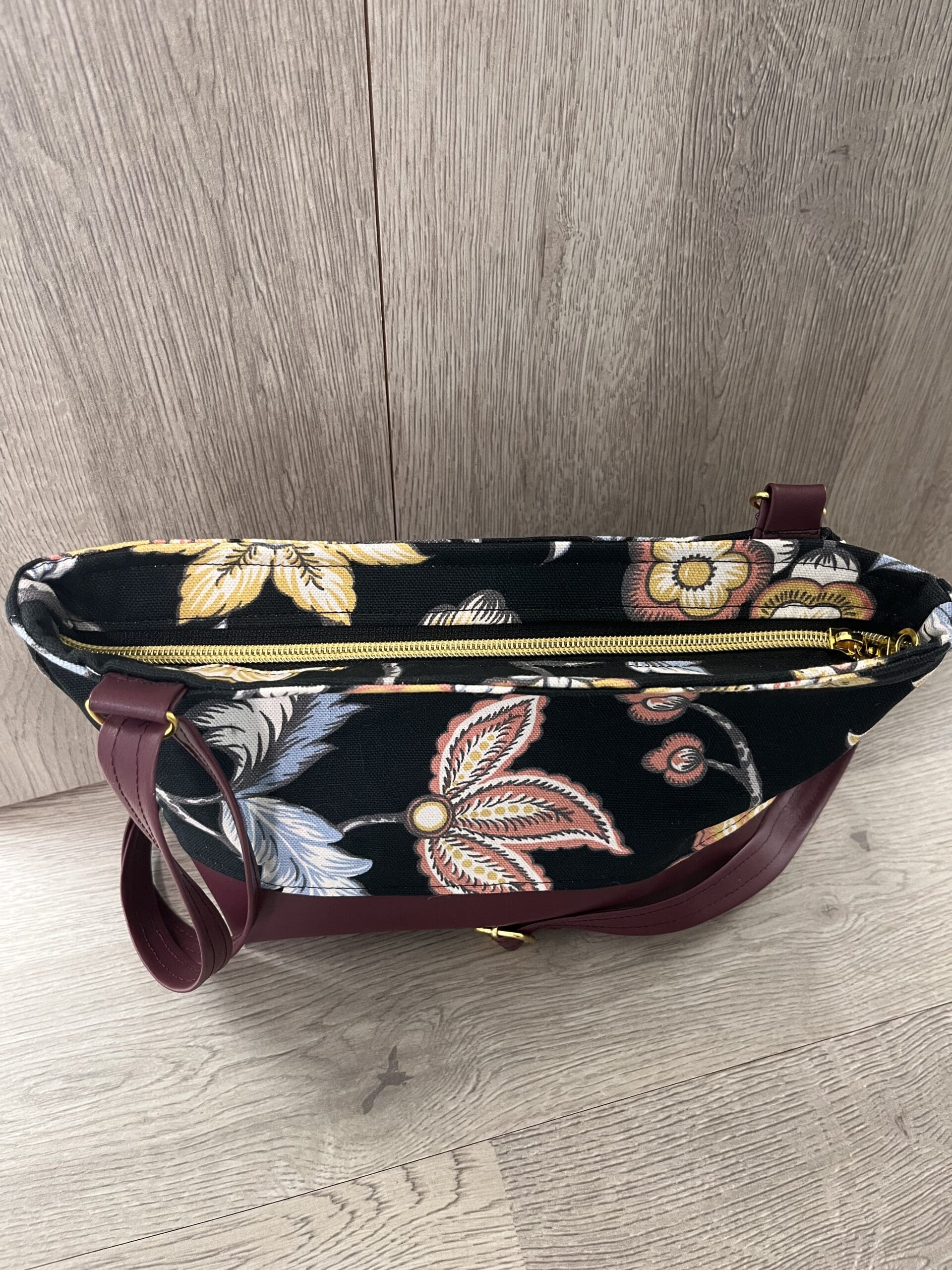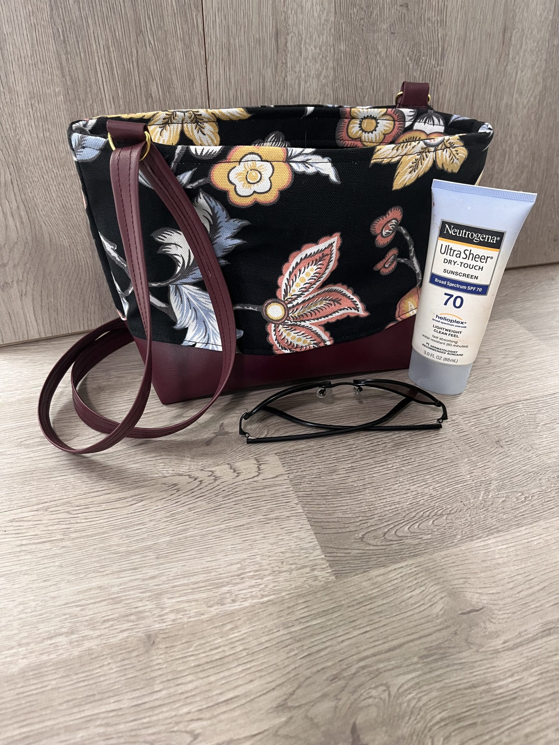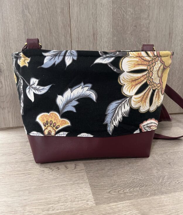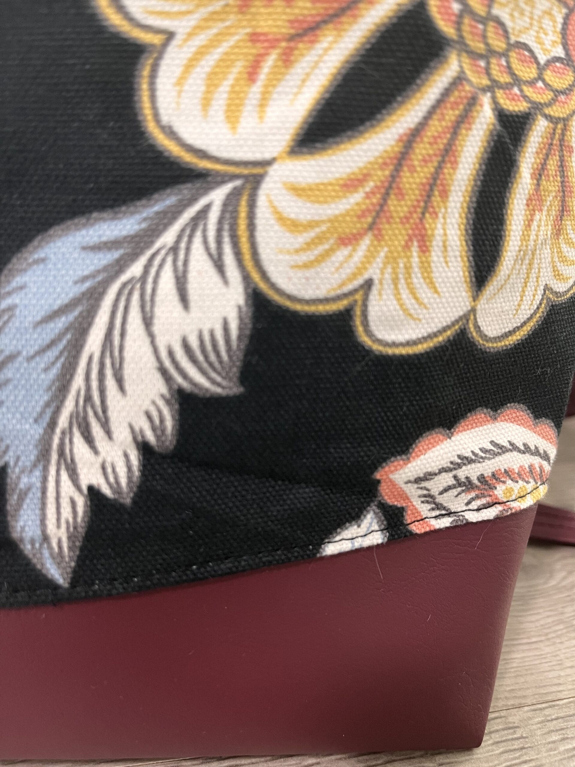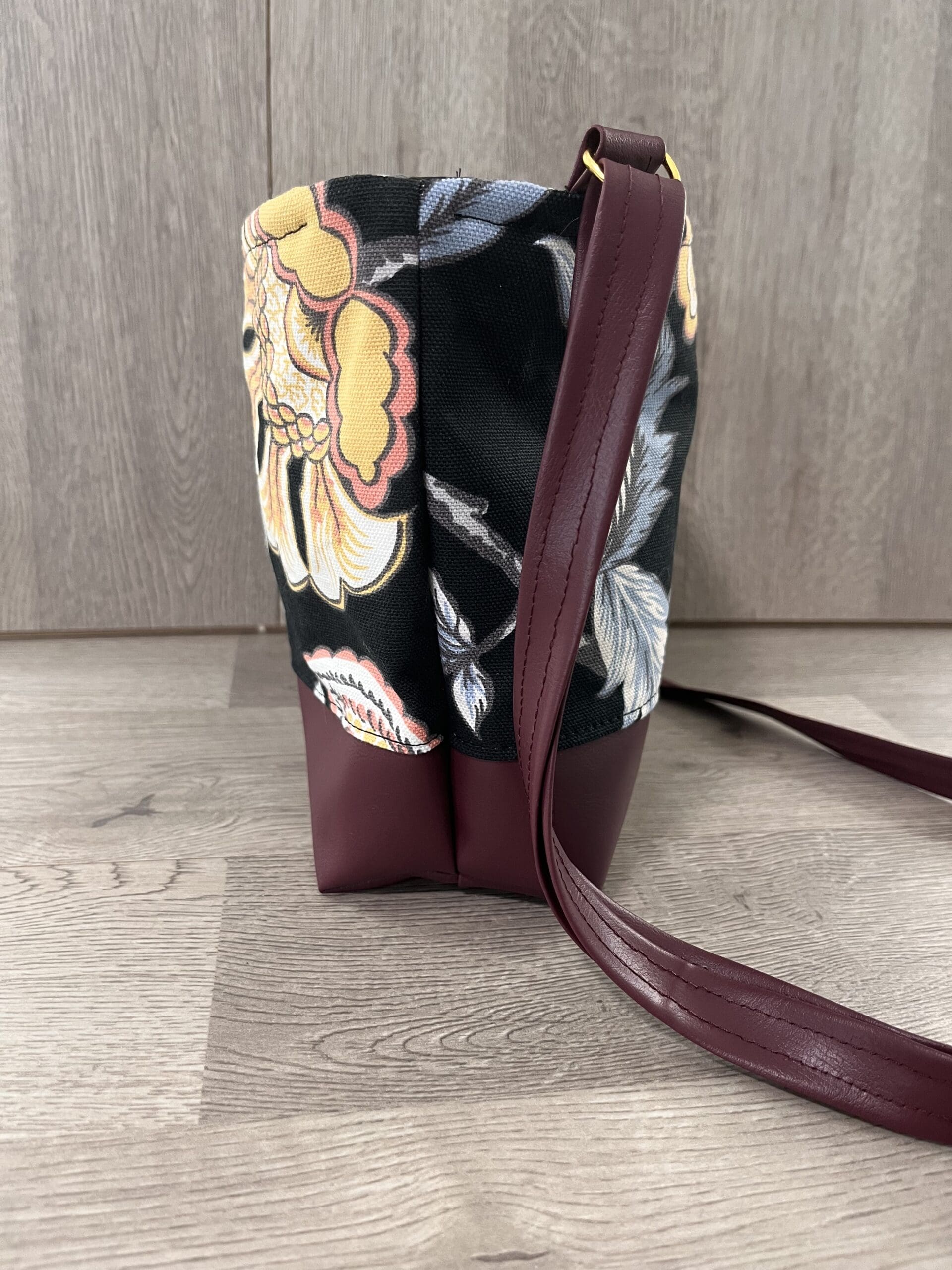 Handmade Floral Crossbody Purse–Black Floral with Burgundy Faux Leather