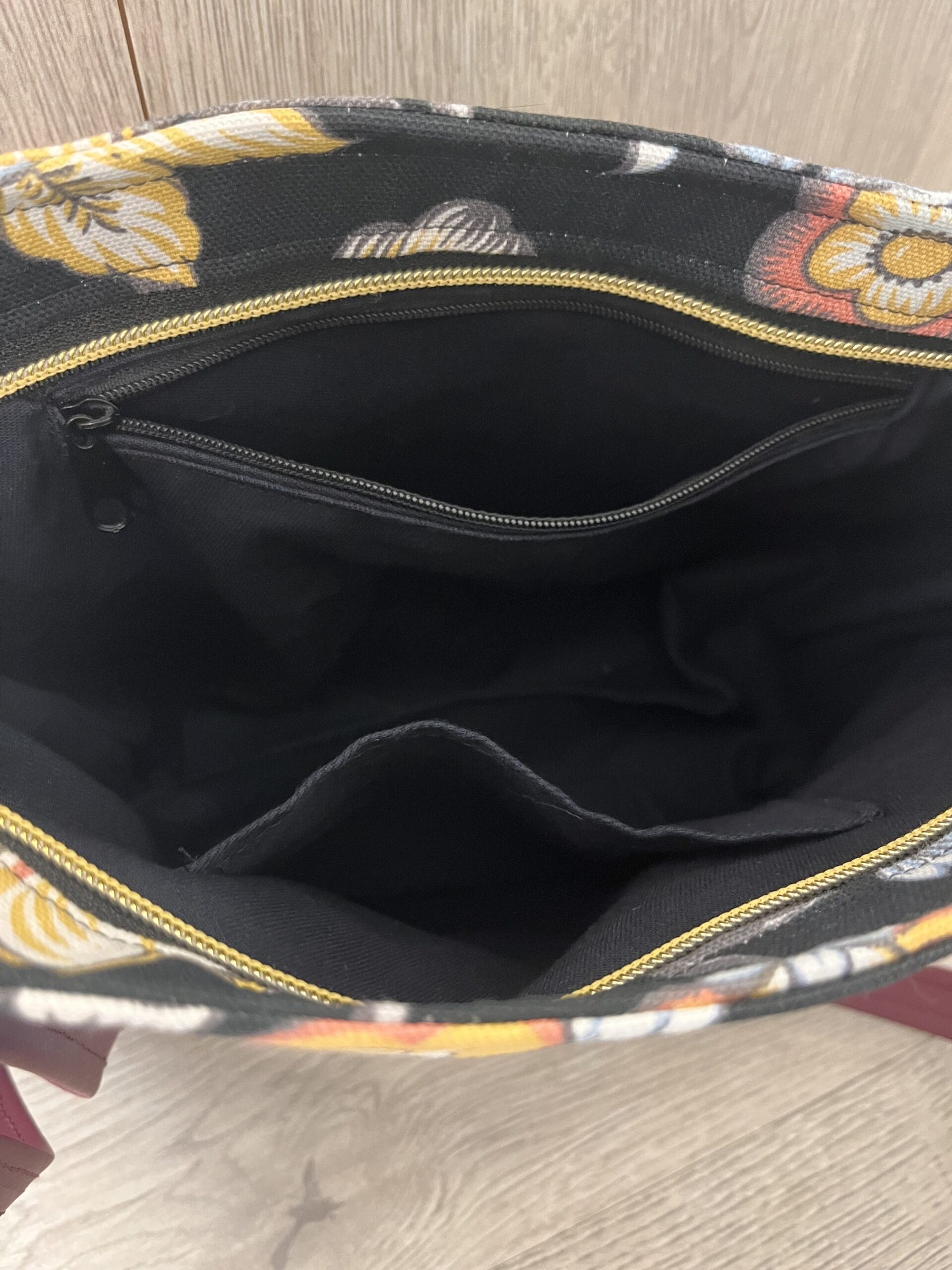 This stylish handmade purse blends bold floral design with rich burgundy accents for a look that is both elegant and practical. The upper portion features a striking black fabric with large golden-yellow flowers and soft white and gray leaves, creating a beautiful contrast against the deep burgundy faux leather base. The purse includes adjustable burgundy straps with gold hardware, allowing it to be worn comfortably as a shoulder bag or crossbody. Its structured shape keeps your belongings organized while adding a polished touch to everyday outfits.