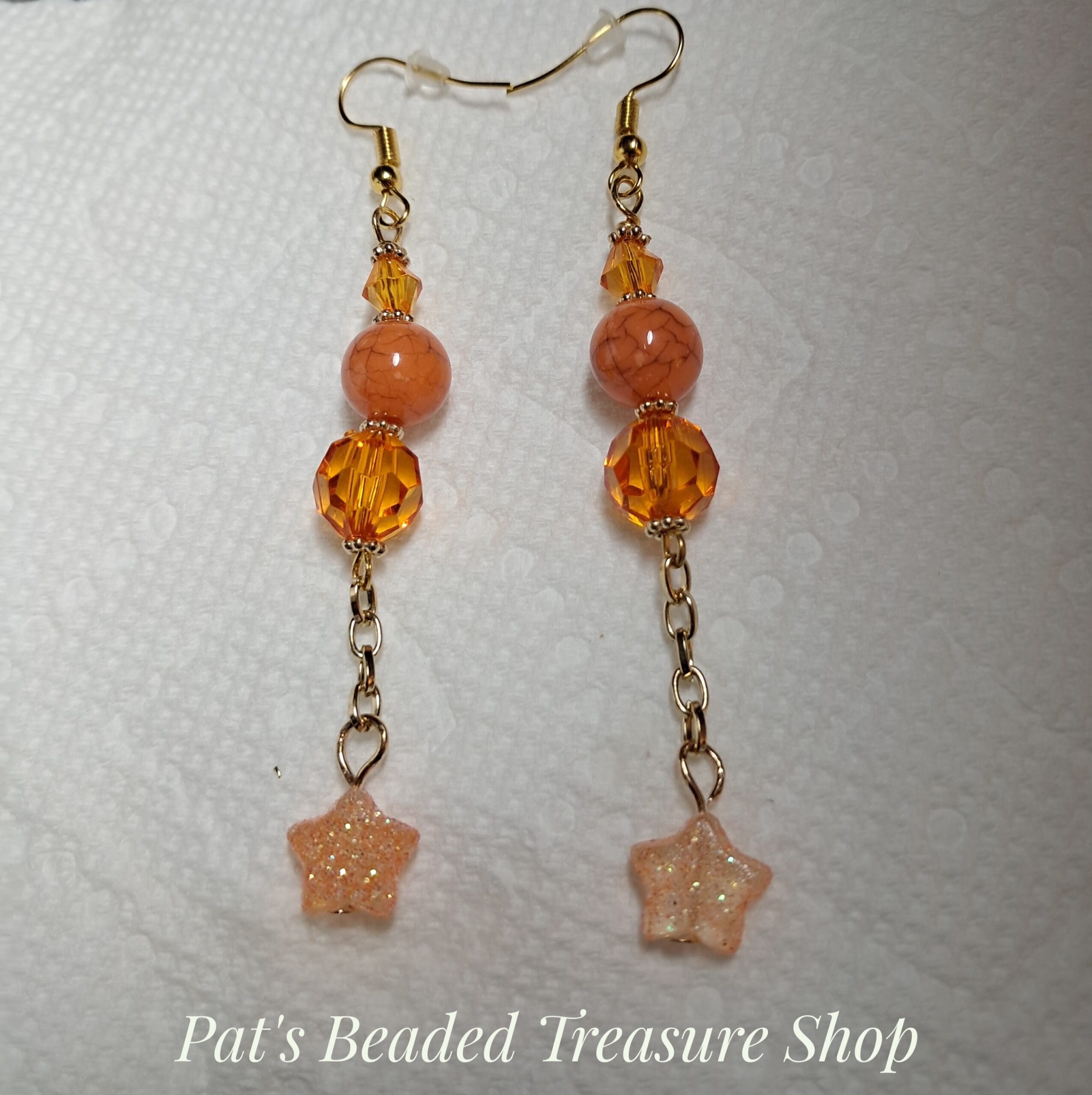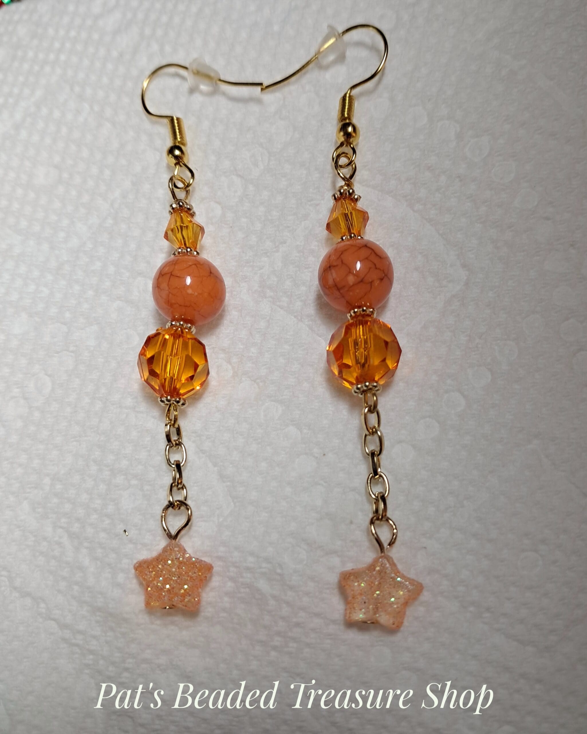 Handcrafted orange and gold dangle earrings featuring acrylic beads and glittering star charms. These earrings combine faceted orange crystal-style beads, crackle-style orange rounds, and dangling acrylic stars on gold-tone chain and gold plated fishhook ear wires.