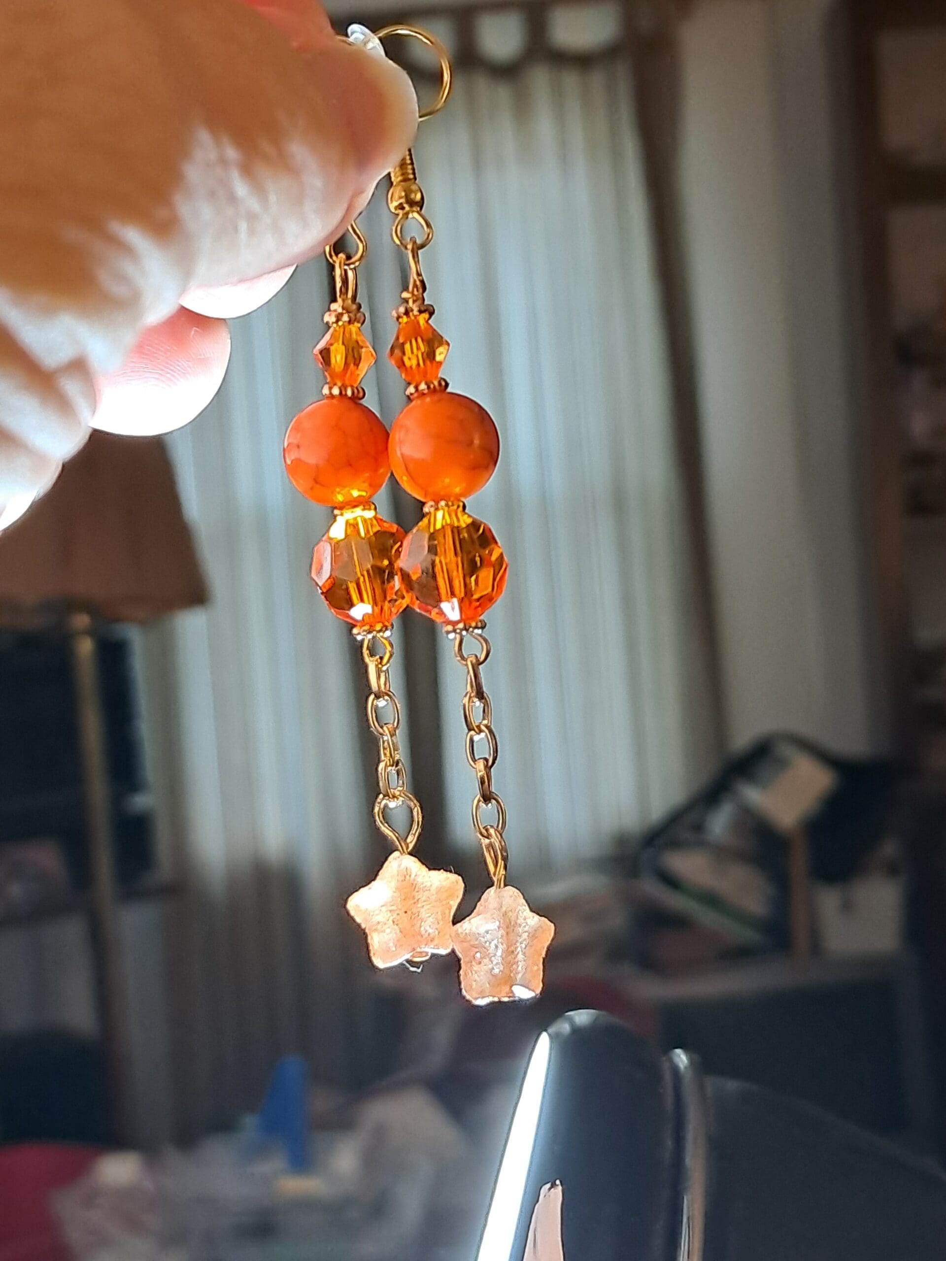 #AcrylicEarrings #BeadedJewelry #HandmadeEarrings #OrangeEarrings #StarCharm #CelestialStyle
