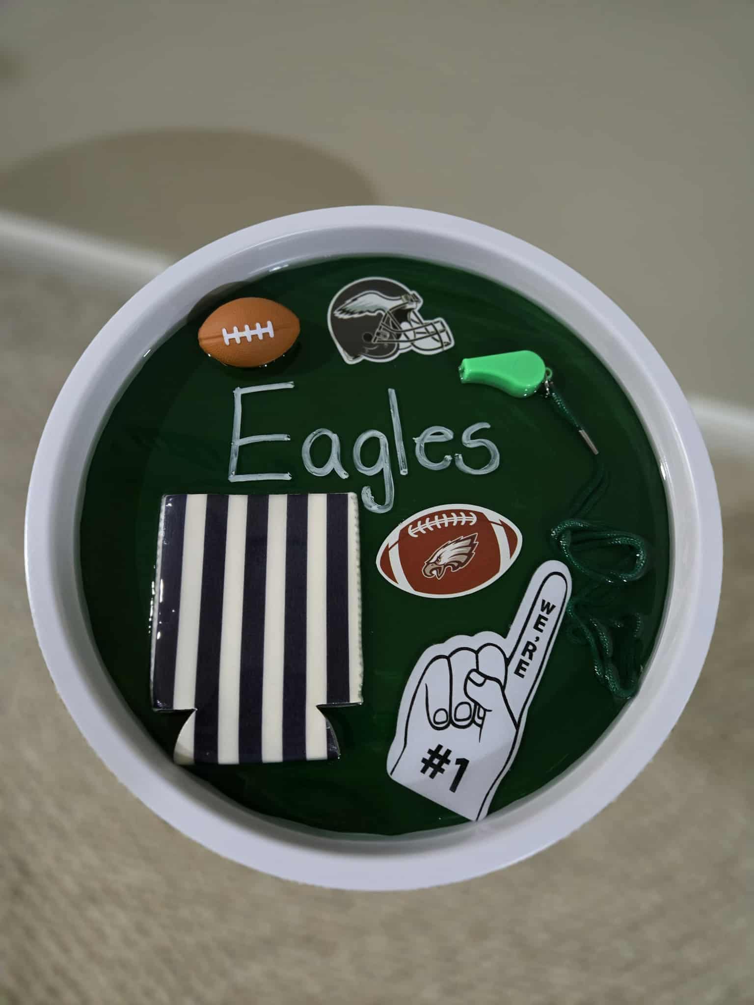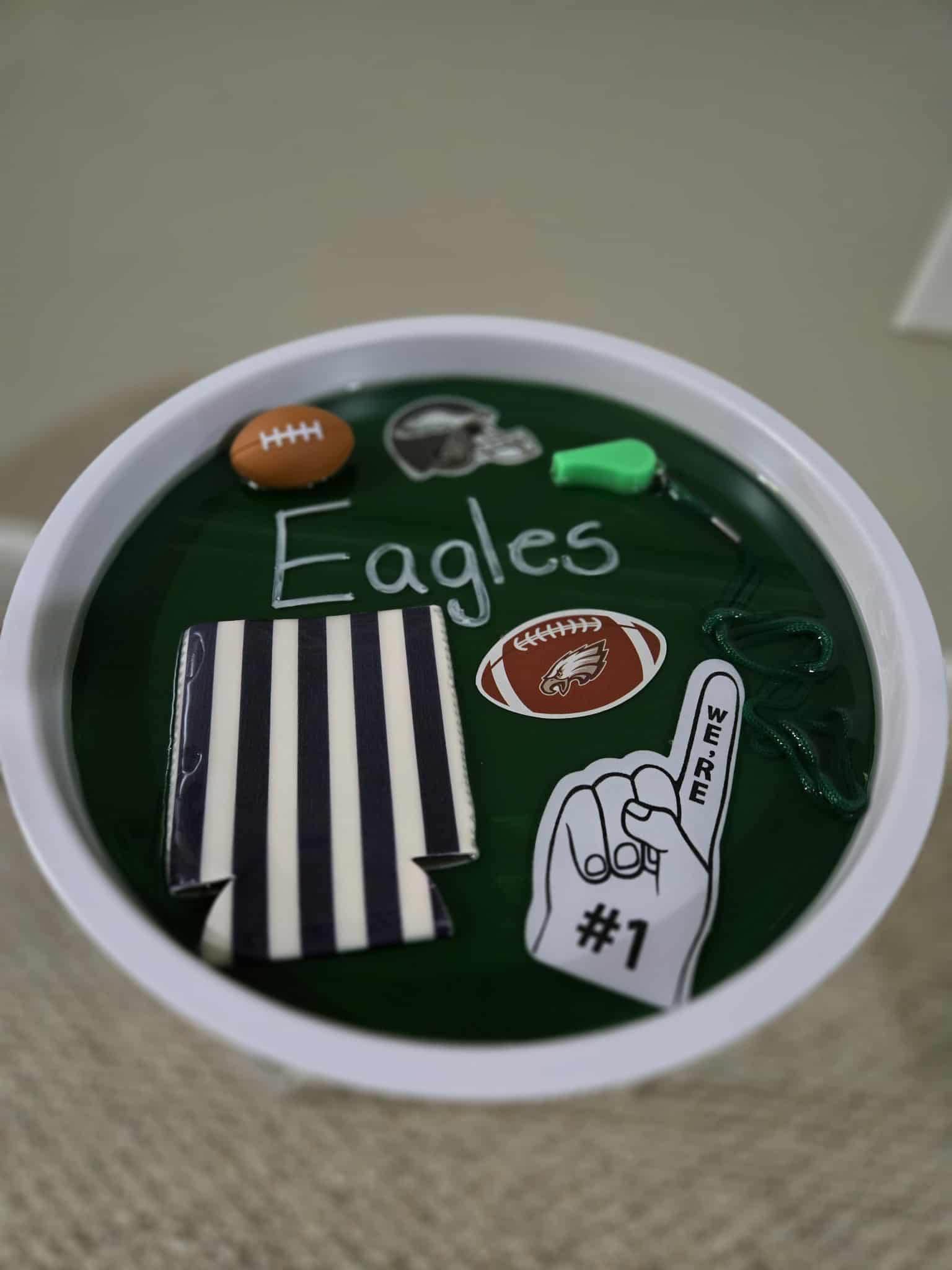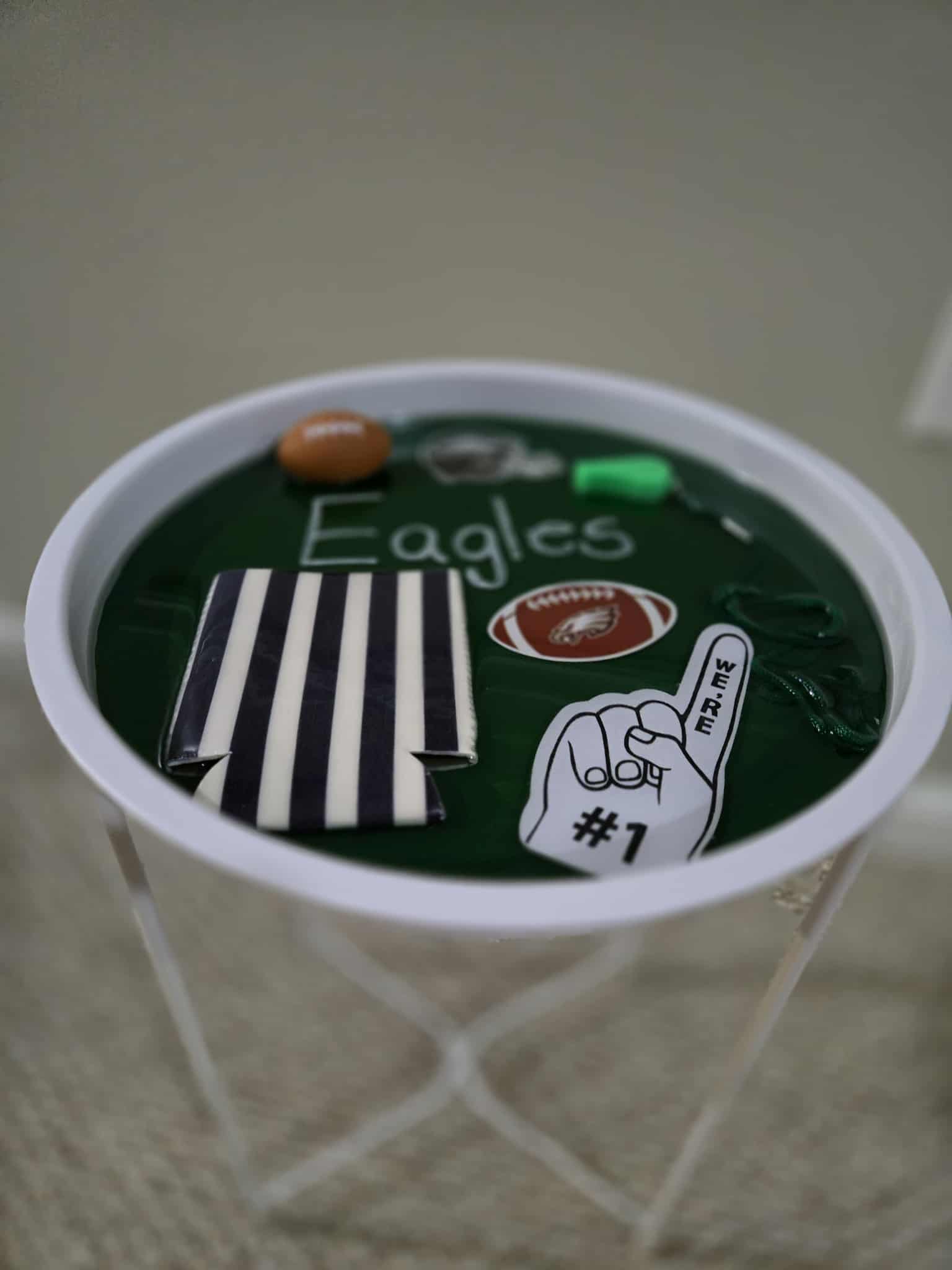 White metal side table, filled with resin and football themed items including foam football, koozie, foam finger, whistle and stickers.
