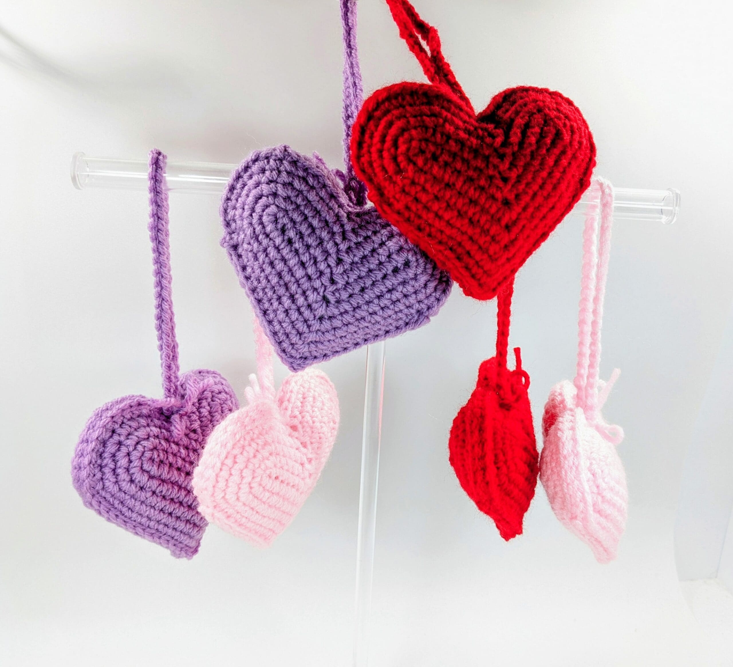 Hanging Heart Valentine Decor Set. You get a fun set of 6 crochet hearts to decorate your home. Also each heart is around 4 1/2 inches wide. You get two Red, Two Pink and two Purple. Also you can have a set made all in one color, message me to place an order. You can find more fun Valentine items in my shop.
