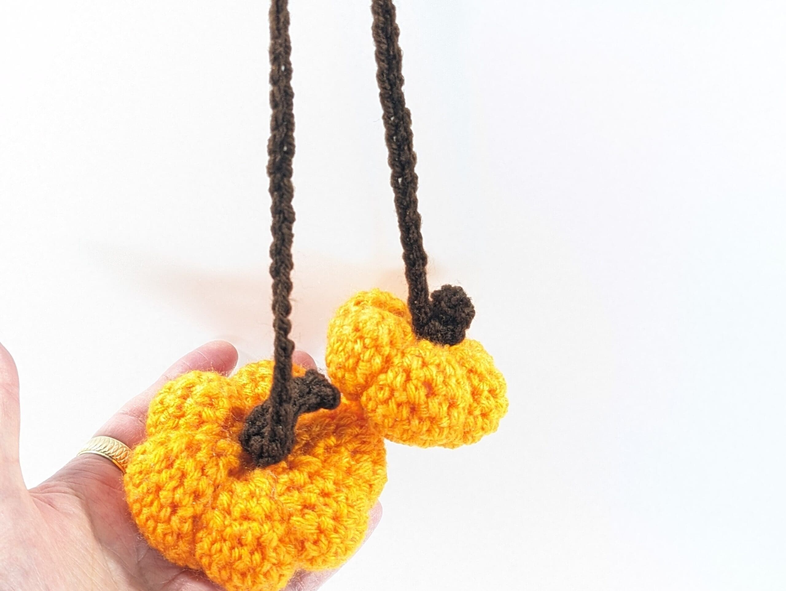 Hanging Pumpkins Crochet Car Accessories. You get two little pumpkins connected with a long chain to hang from your car mirror. Also you can hang this cute set almost anywhere you like. You can find a selection of more fun items to hang in your car or home in my shop.