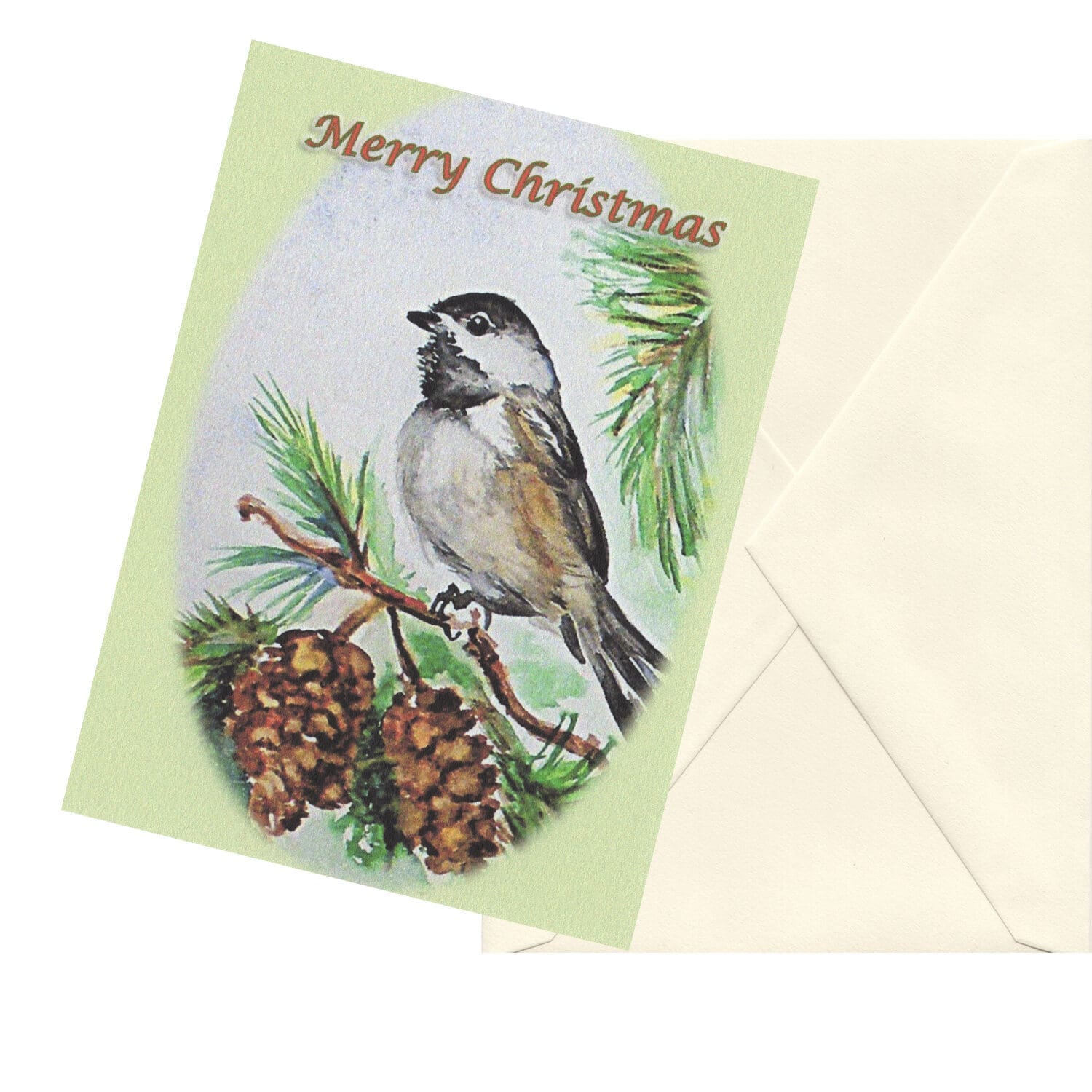 LIMITED STOCK ON CLEARANCE! This card is under a folded half-sheet in size. This card is lightweight, with a pebbled matte finish, printed on 100 percent cotton paper. Share the beauty of nature with our Happy Holidays 2 Birds Watercolor Nature Art Greeting Card Set. These cards will inspire and delight, featuring stunning nature watercolor artwork of a Female Cardinal wishing you Happy Holidays, and a Merry Christmas Chickadee. Four Happy Holiday Cards and one Merry Christmas Chickadee card to cover everyone on your list. Perfect for sending heartfelt messages to your loved ones. Share the joy of nature with your friends and family through this six-card set!