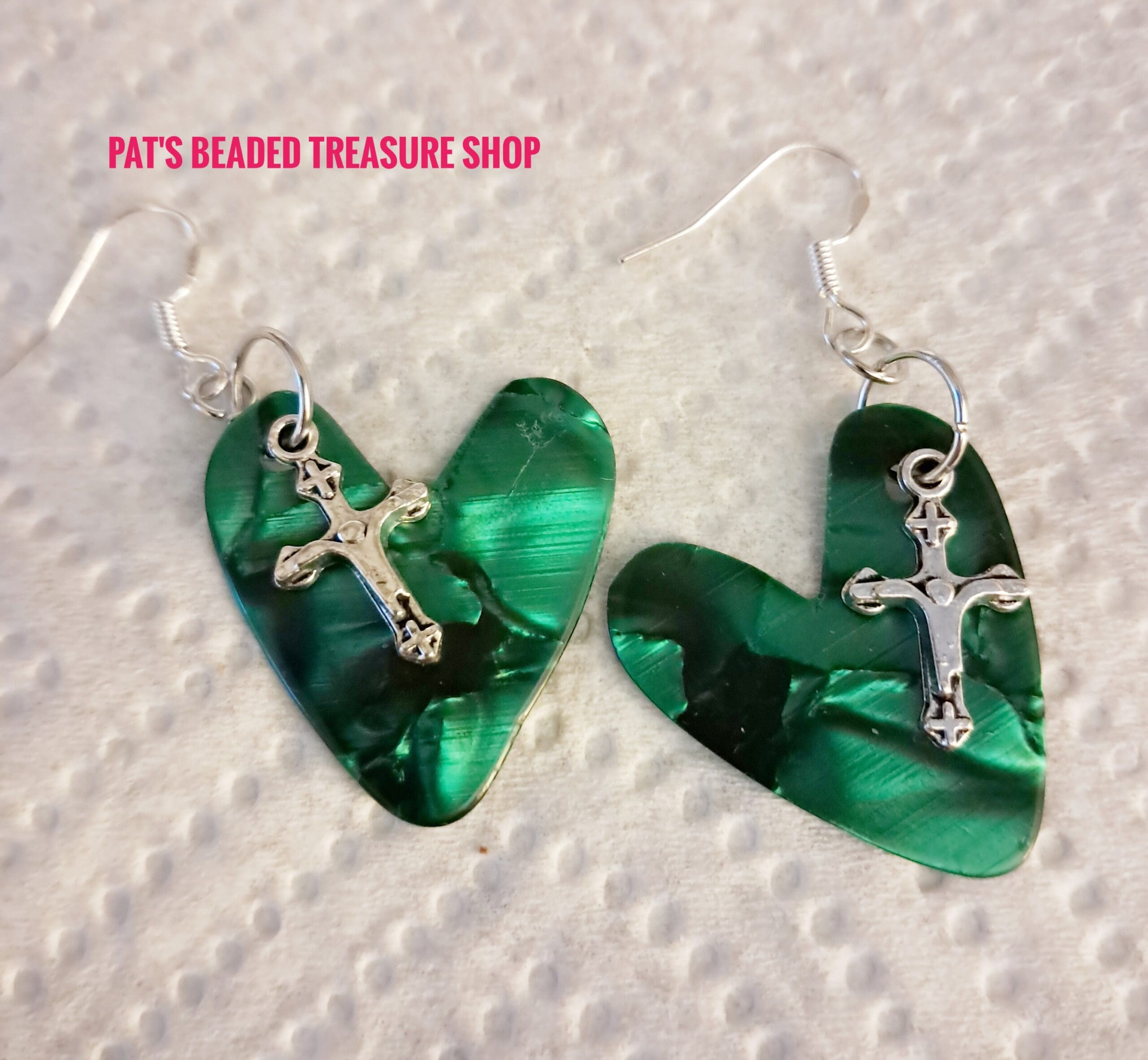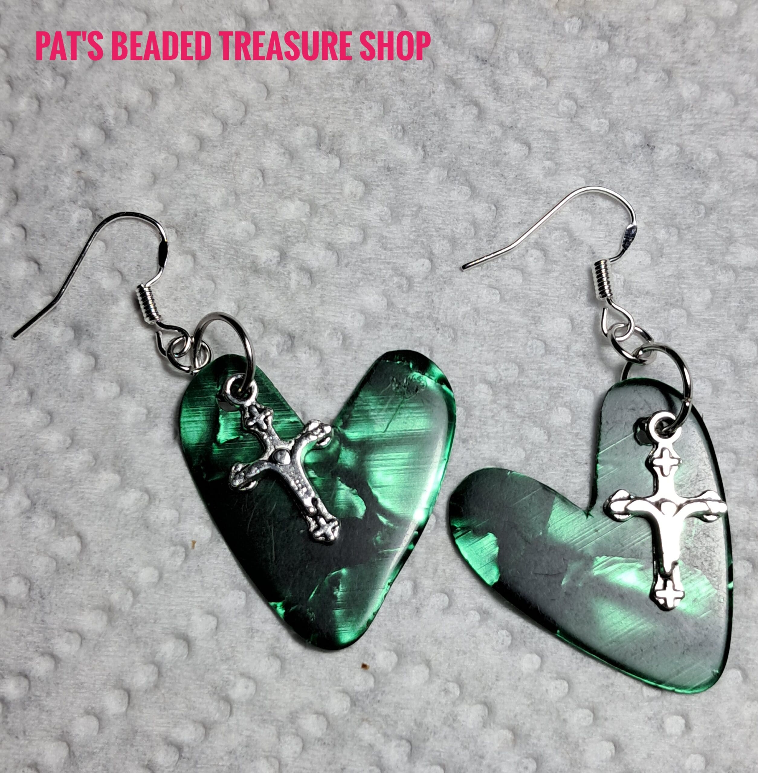 These green guitar pick heart earrings feature a silver cross detail and sterling silver hooks — a unique mix of music, faith, and fashion. 🎶💚✝️