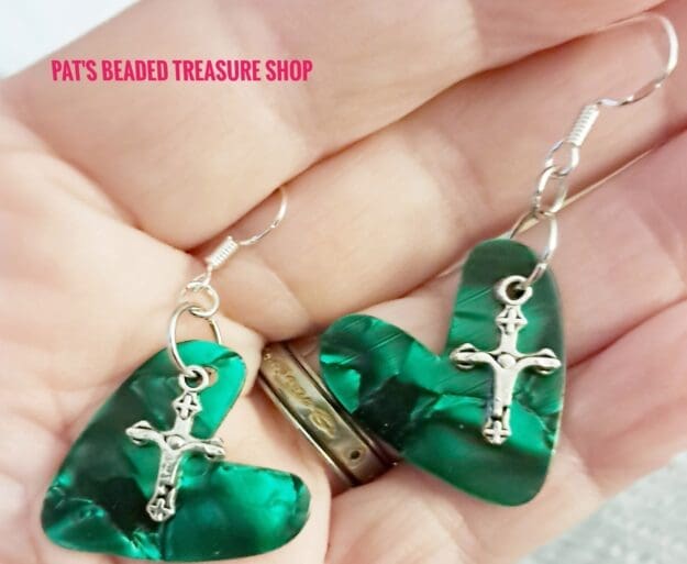 These unique earrings feature a shiny green, pearl-like guitar pick with a silver cross embellishment. They hang from .925 sterling silver fish hook ear wires for comfort and durability.