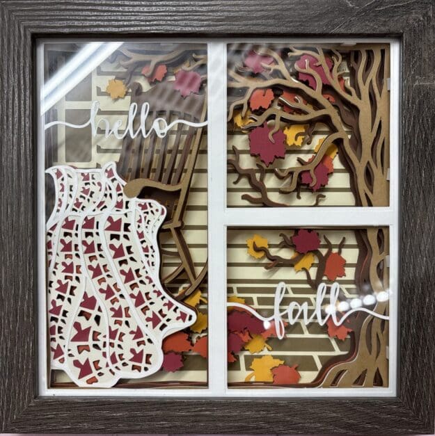 Each layer is carefully cut and assembled by hand to create depth, texture, and natural shadowing that gives this fall shadow box a dimensional look. Warm earth tones and classic autumn colors help this piece blend effortlessly with farmhouse decor, rustic interiors, and modern seasonal displays. The porch inspired layout adds visual interest while still feeling calm and balanced.