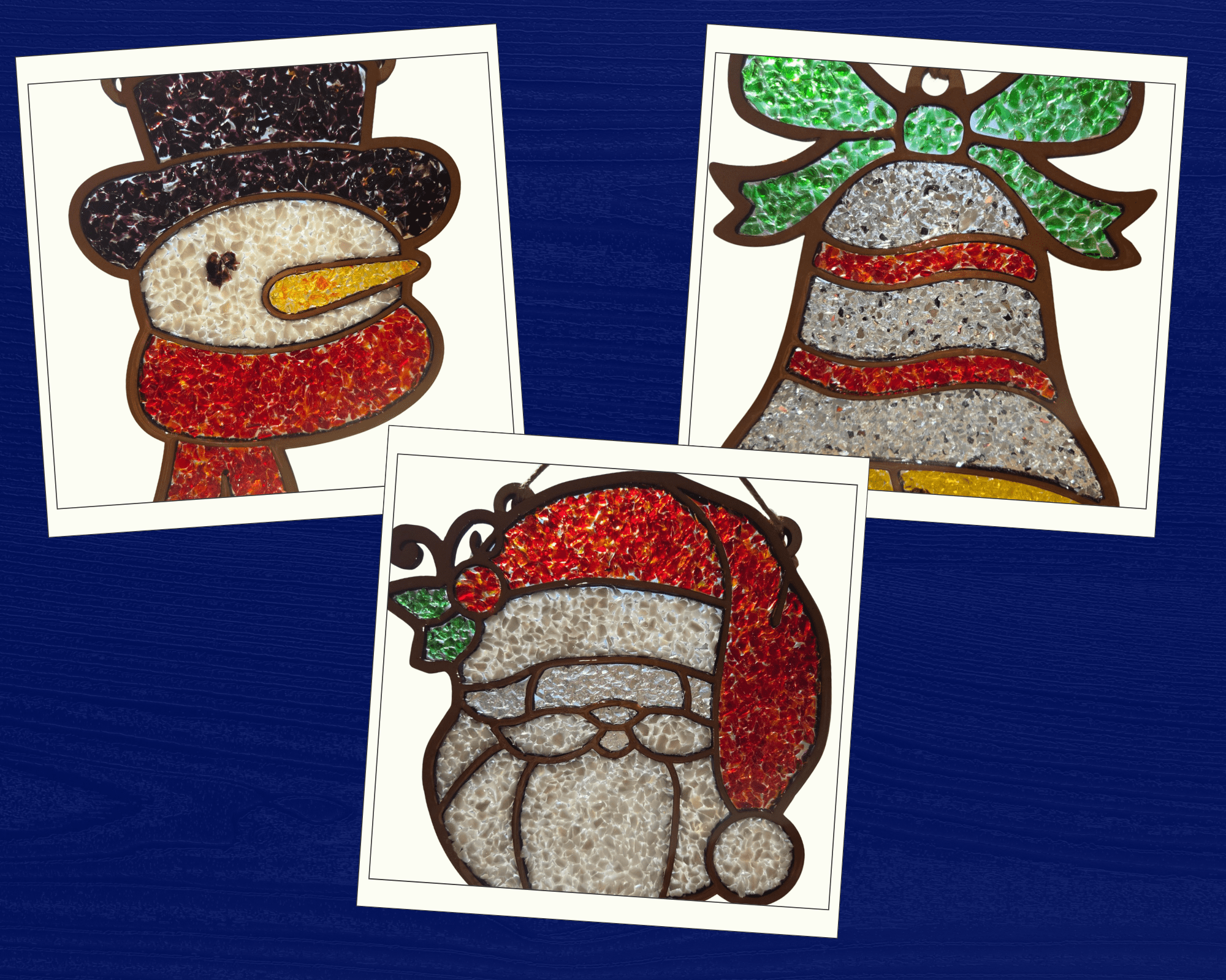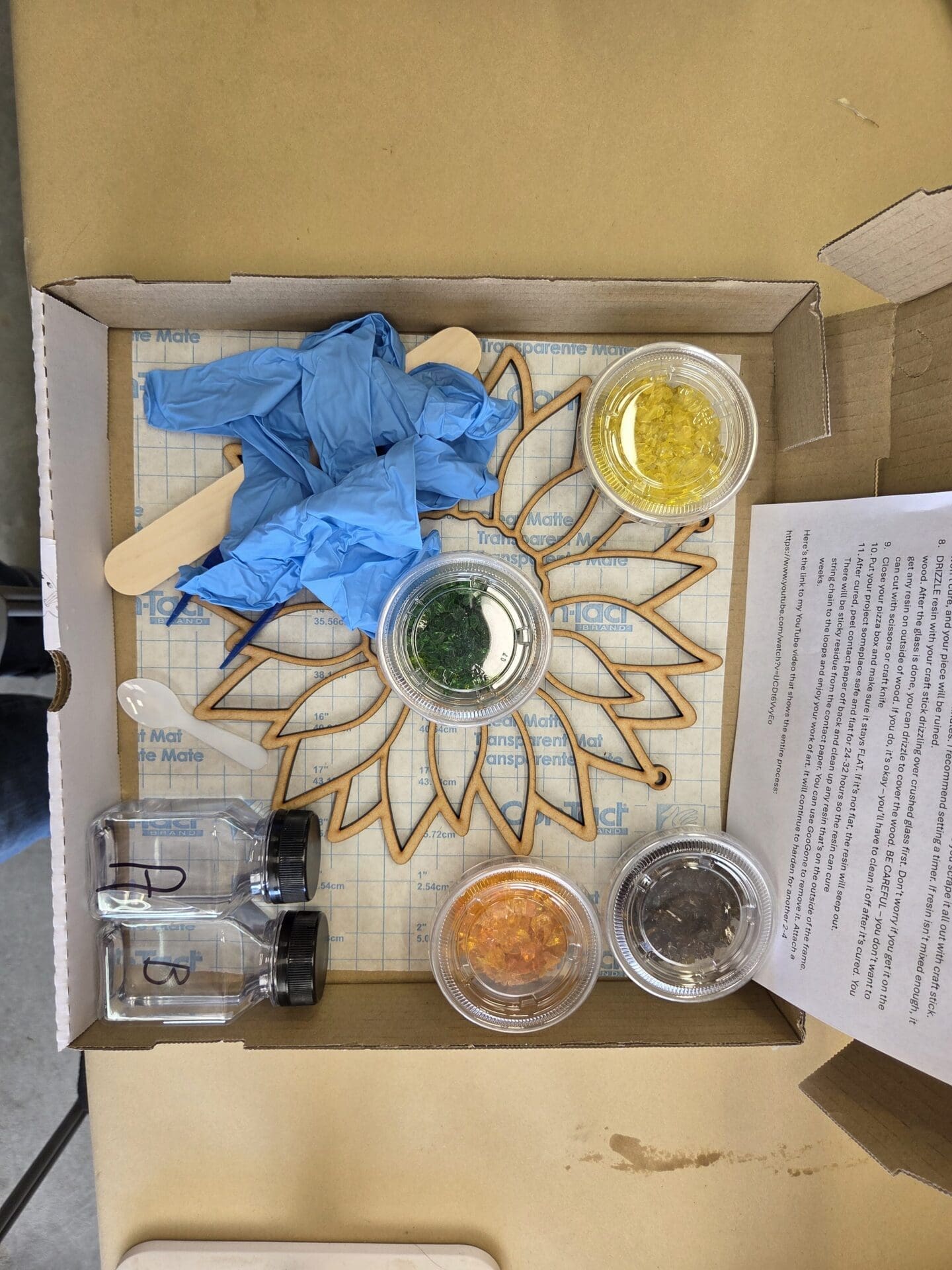 Illuminate your space with a stunning handmade suncatcher! This Holiday Suncatcher kit provides everything you need to craft a dazzling suncatcher using crushed glass, wood, and resin. Packaged neatly in a pizza box, the kit includes all essential materials, except a disposable cup for mixing and goggles for eye protection, so you can dive right into creating your masterpiece. There are printed instructions and a YouTube link you can watch the process and follow along.