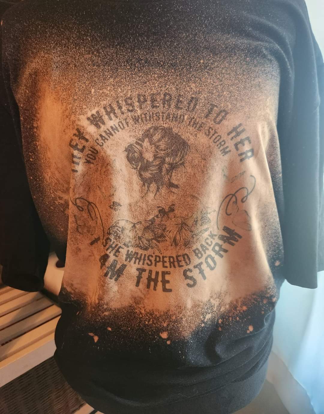This “They Whispered to Her I Am the Storm” bleached tee is a captivating blend of bold design and rugged style. Crafted from soft, breathable cotton, this tee features a striking bleached effect that gives each piece a unique, weathered appearance.