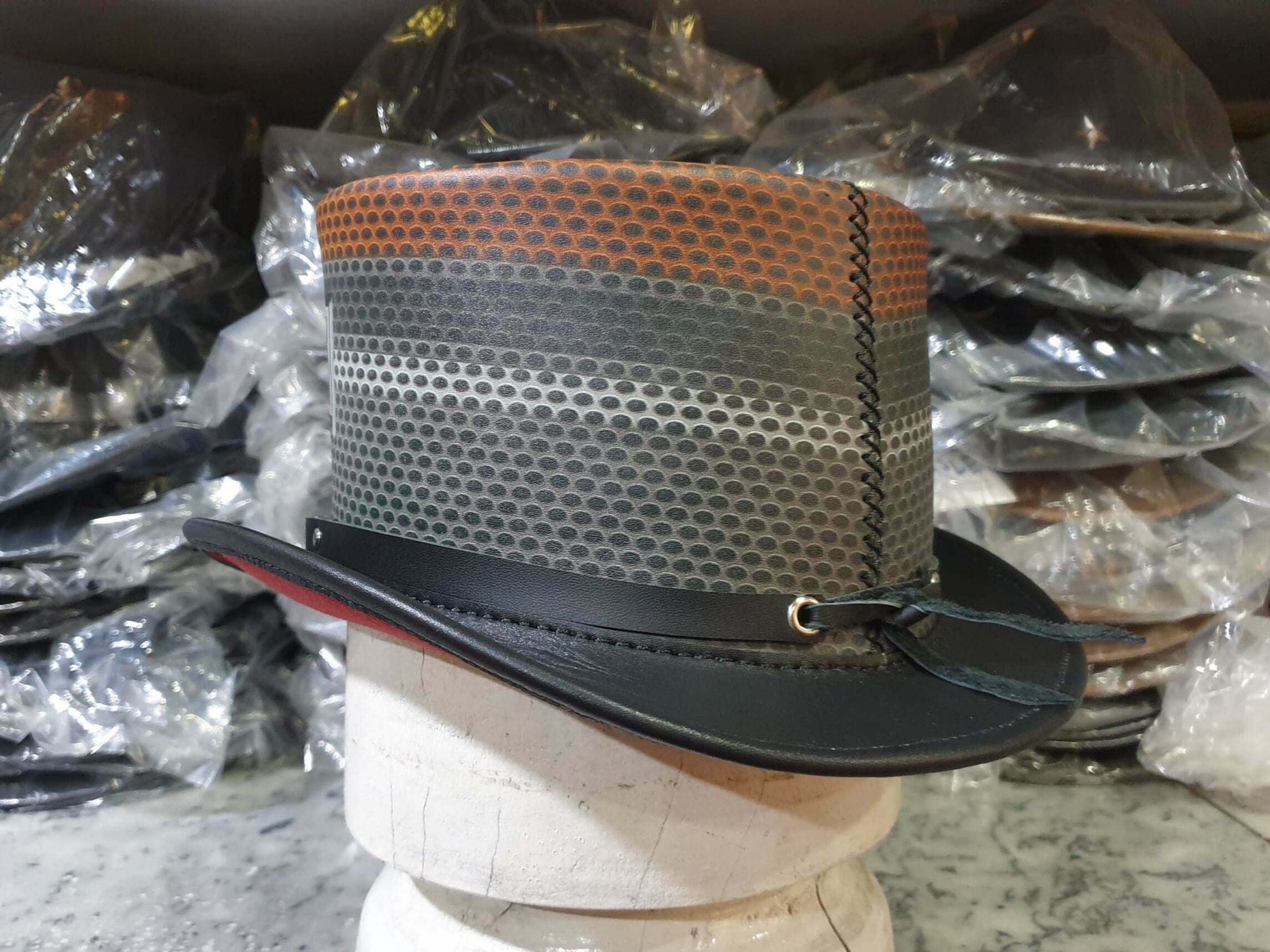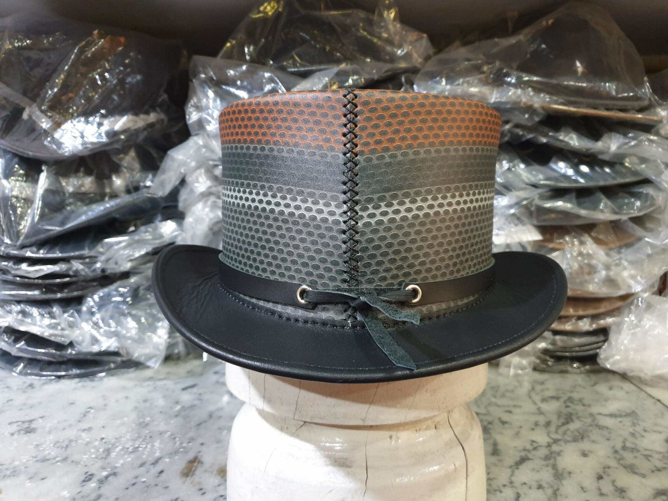 The top hat is crafted from high-quality leather, providing durability and a rugged aesthetic.The silver metal skull chain band adds a touch of rebellious charm, enhancing the hat’s overall appearance.