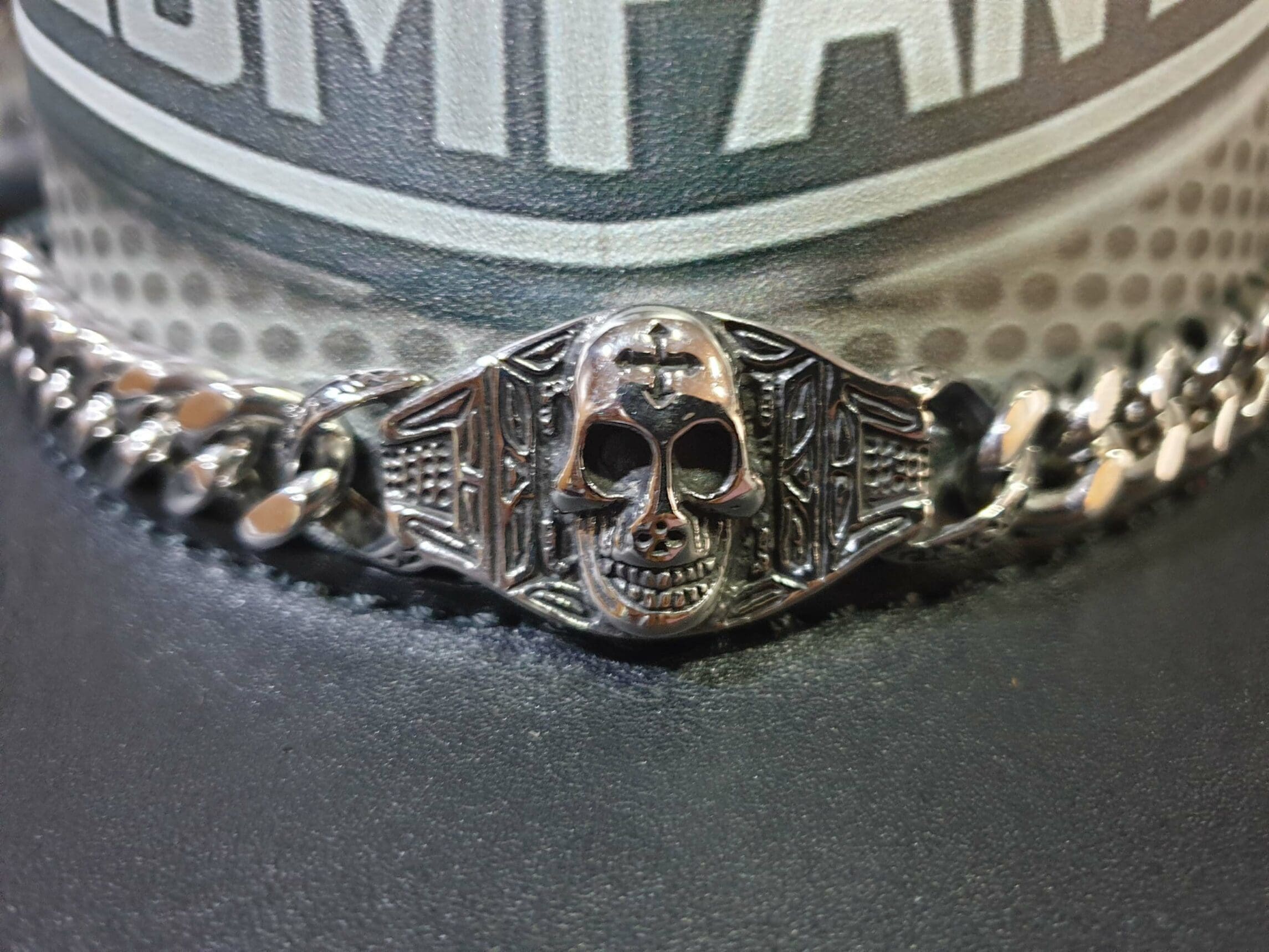 The silver metal chain band features skull motifs, contributing to the hat’s bold and edgy design. The chain wraps around the hat, adding a touch of rocker-inspired style.