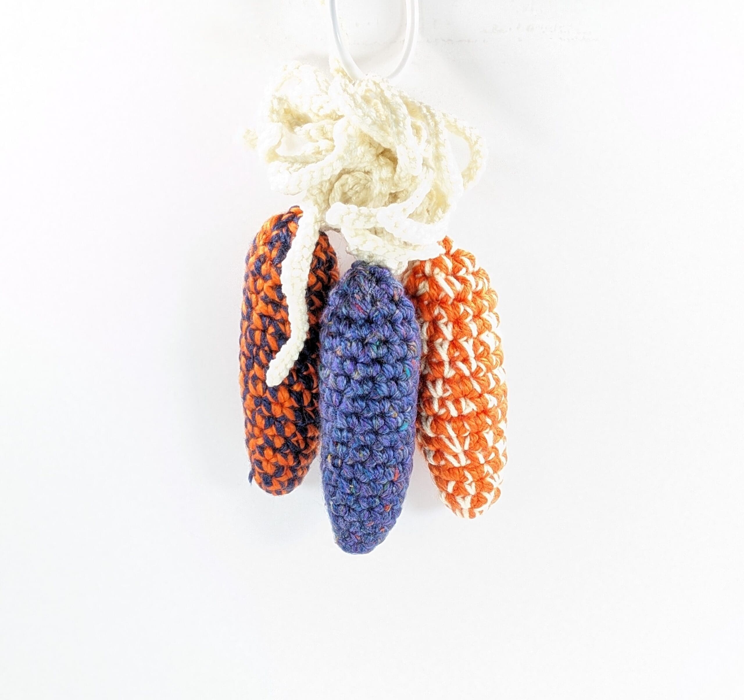 Indian Cron Crochet Fall Decor. You get a set of three crochet Indian corn. Also this set is unique to it’s colors but can be made in more solid color. You can hang this set on your front door or in any room, this set measures a total of 9″, each cob is 5 1/2″. Also They look great attached to a wreath or in a large bowl on the table with assorted pumpkins and gourds. You can find a nice selection of more Fall & Thanksgiving items in my shop.