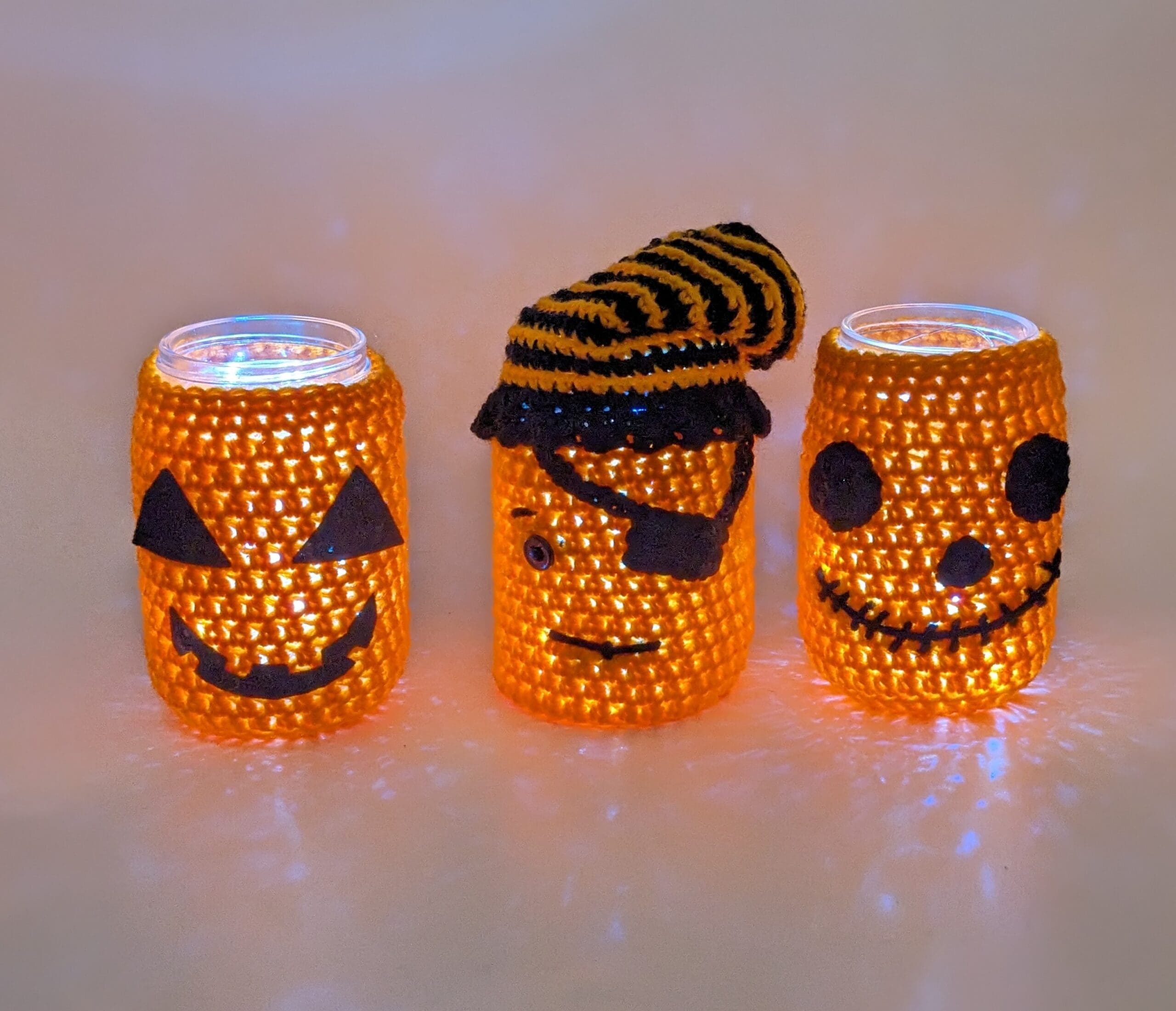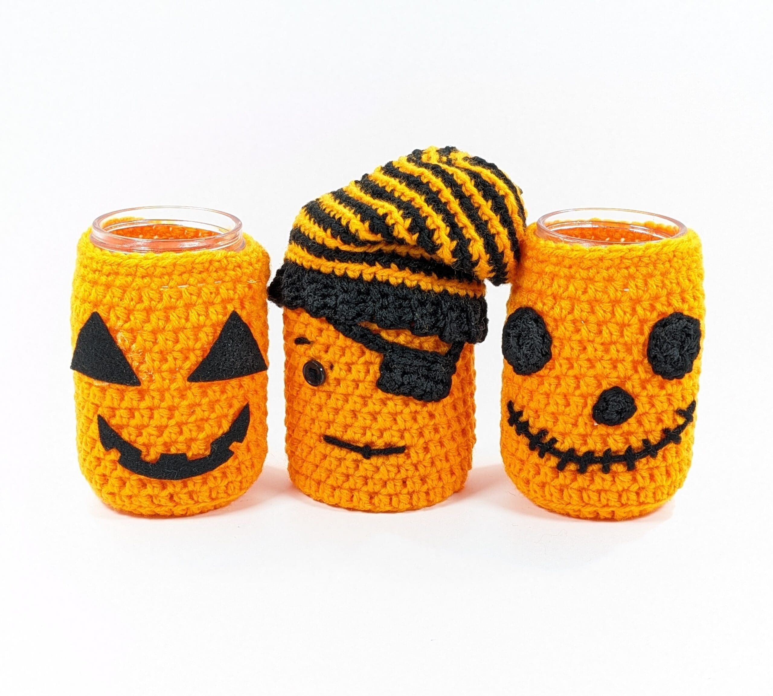 Jack-O-Lantern Crochet Mason Jar Covers. You get a set of 3 crochet covers that fit onto a pint size mason jar. (Jars Not Included). Also you can use them just as a room decor or fill with candy or light up with LED lights. You can fill with fall flowers. Also use as a table center piece. You can find a large selection of more fun Halloween and fall items in my shop.