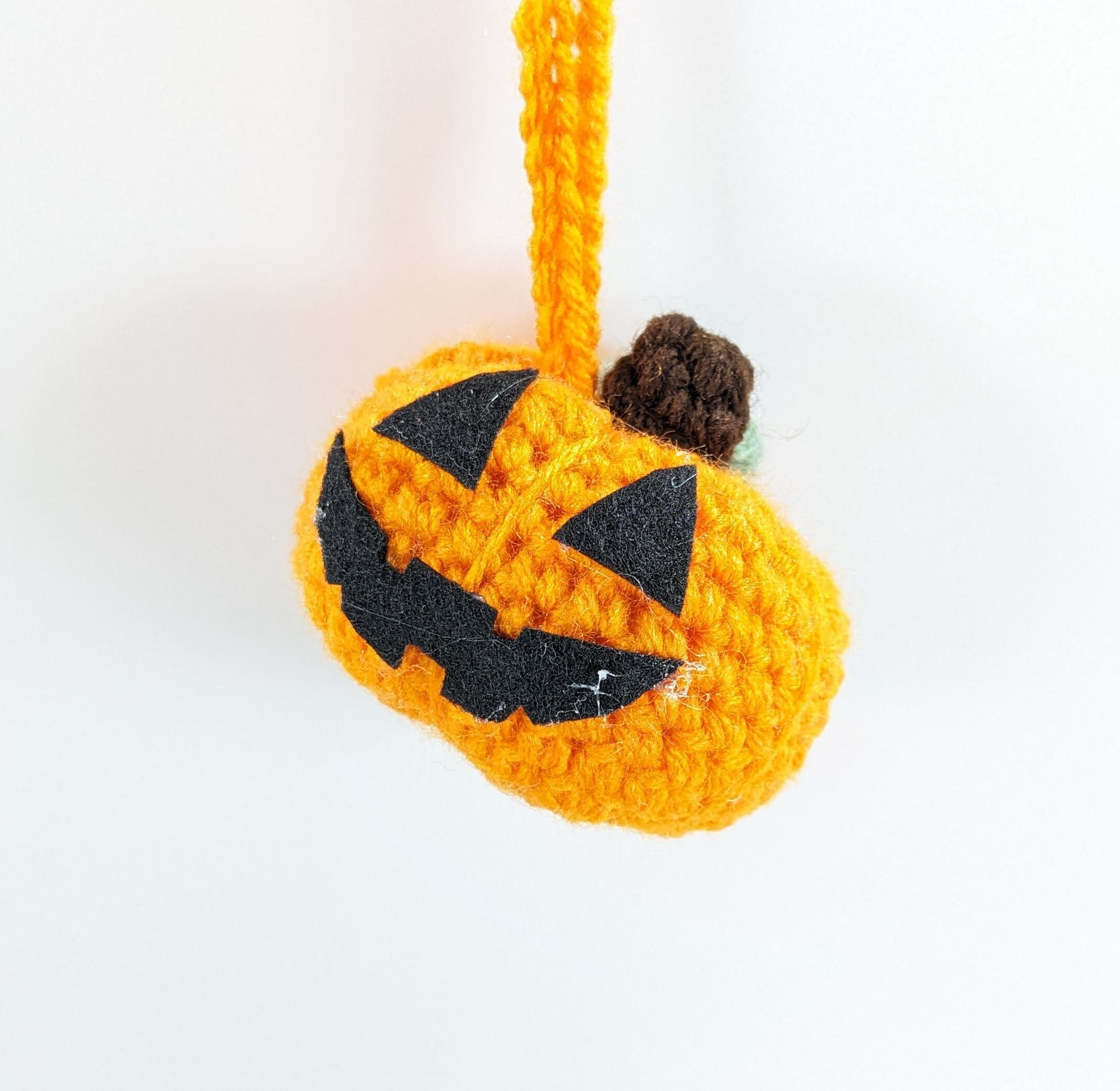 Also this cute Jack – O – Lantern Plush Car/Home Decor is crochet with acrylic yarn and filled with a small amount of fiberfill. His mouth and eyes are made of felt and glued on.