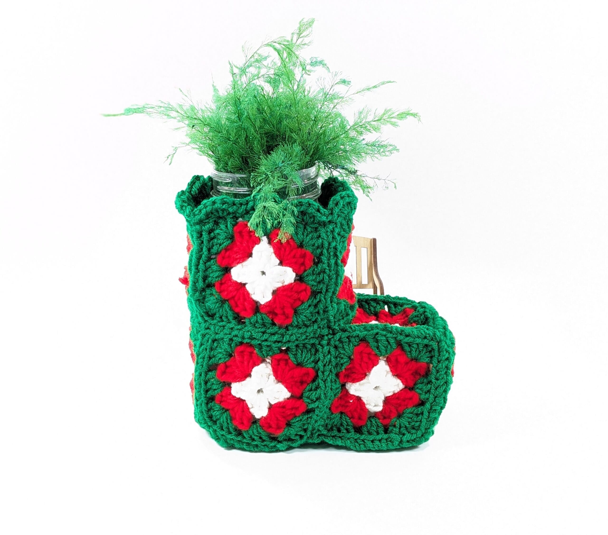 Mason Jar Boot Crochet Decor. You get this adorable crochet boot shape that fits over any quart size jars (Jar Not Included). Also This boot is made up of 13 granny squares all in holiday colors. You can use LED lights to light it up. Also you can fill with small pine branches or cut flowers. You can find a fun selection of Christmas decor and items in my shop, link below.