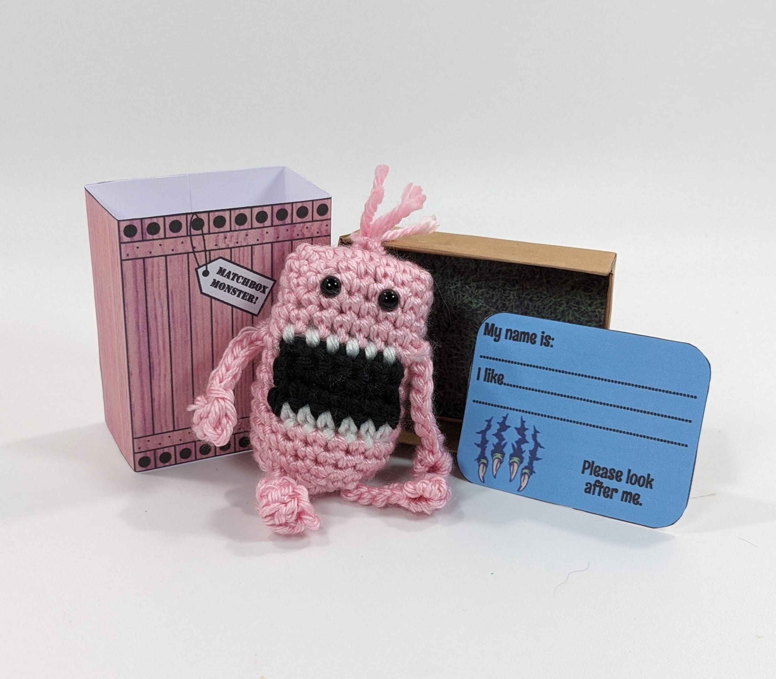 Also this cute Matchbox Big Mouth Crochet Alian Toy is hand crochet with acrylic yarn and has tiny plastic safety eyes (not recommended for children 3 and under). The box is made with cardstock.