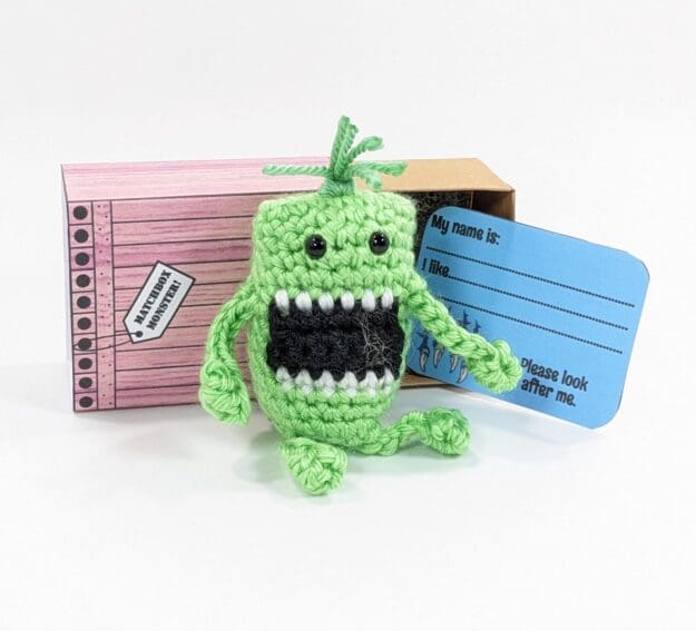 Matchbox Big Mouth Crochet Alian Toy. Your child will love this adorable collectable little Big Mouth Alian. Also he comes in his own little matchbox, (3 X 2 1/2″) the monster measures (2 1/2″) and comes with a card for you to give him a name. You can adopt him and give him a home. Also you can find more fun Matchbox Pets in my shop. You can find a fun selection of other fun items at my website https://barbsyarngallery.com