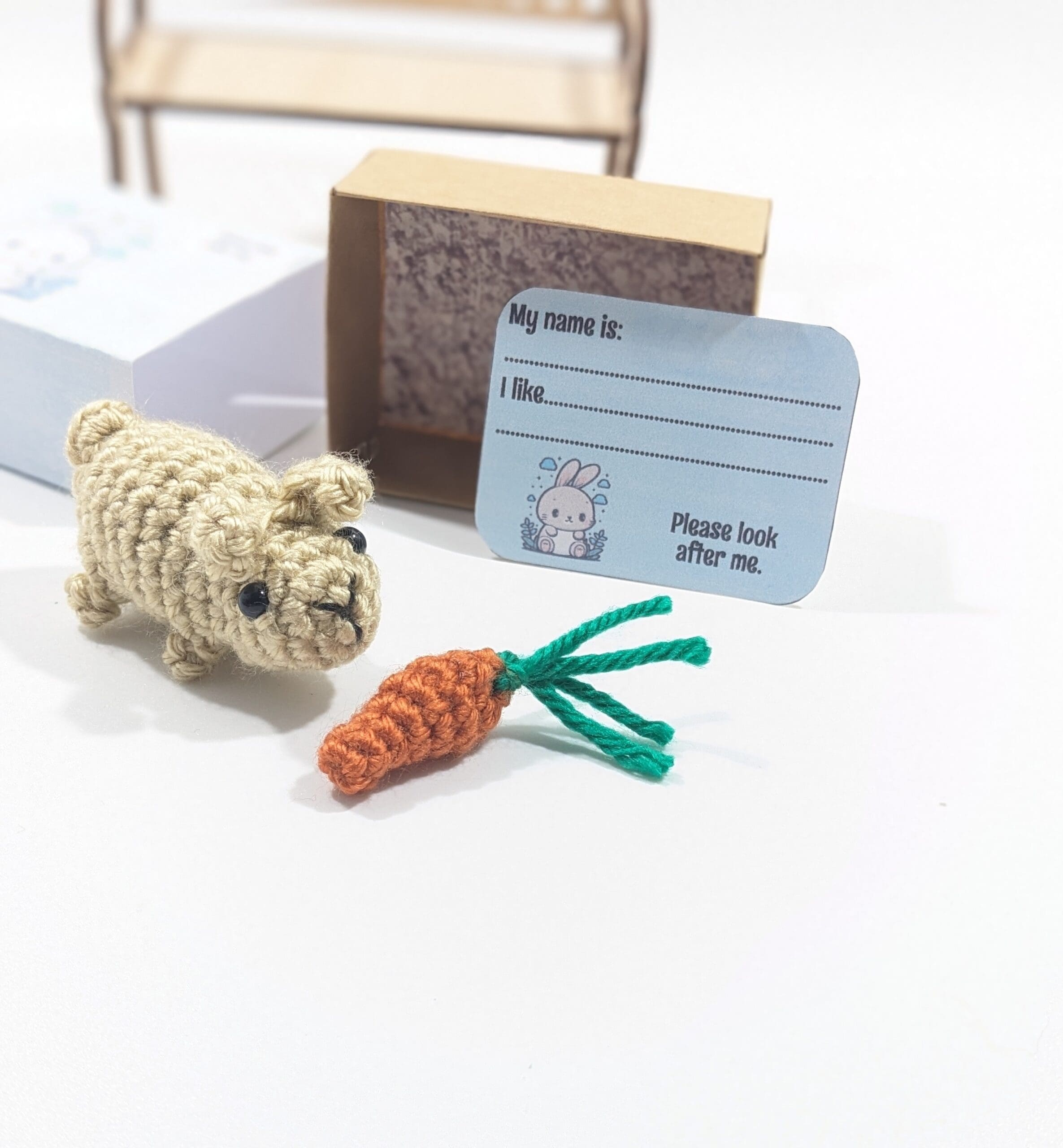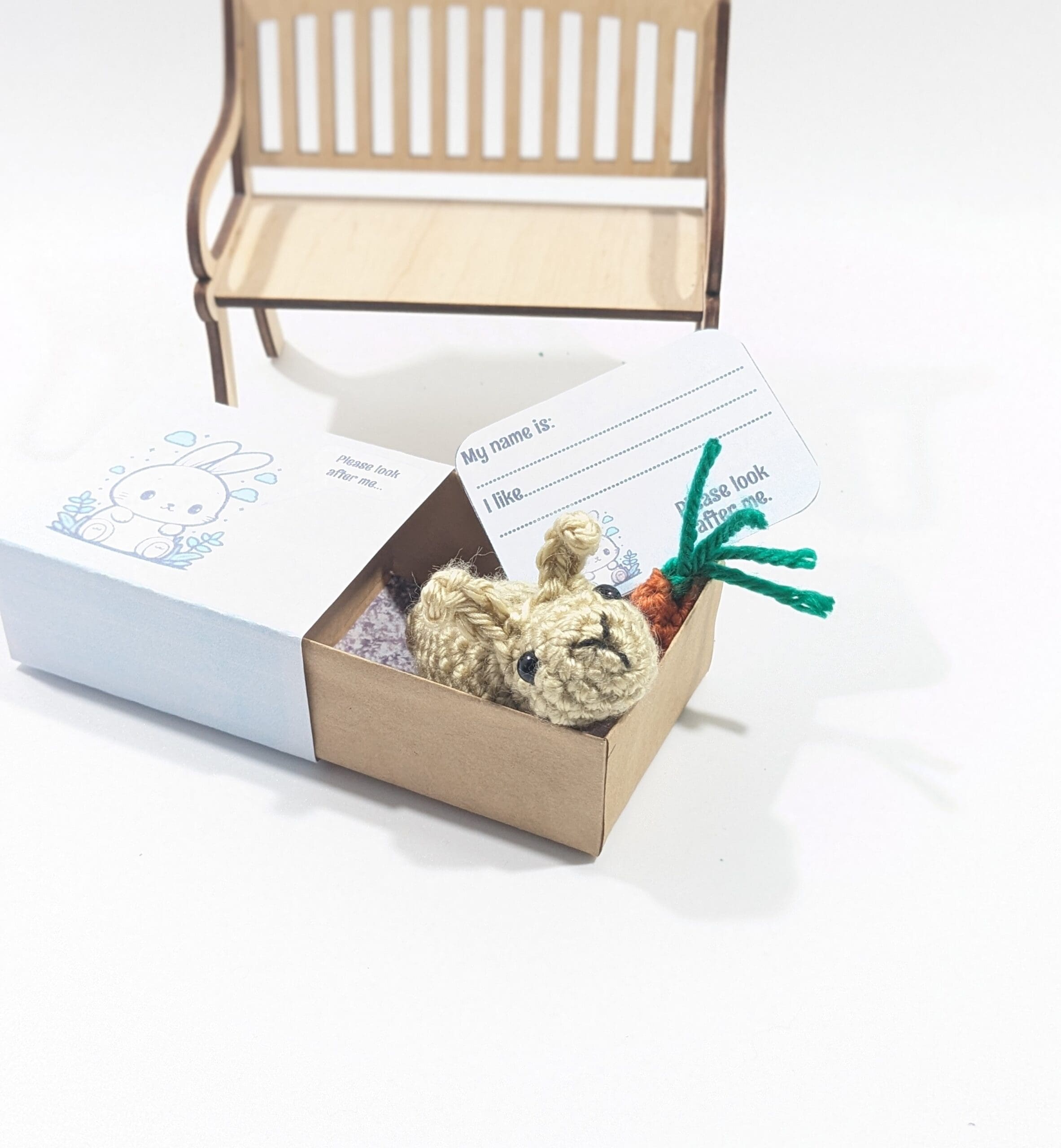 Matchbox Mini Crochet Bunny Play Set. This cute tiny Bunny comes in a small Matchbox. Also this Matchbox is his very own cozy be. He also has a tiny carrot and comes with a card for you to give him a name.