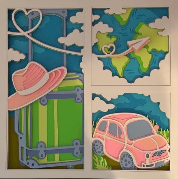 Celebrate your love of adventure with this handcrafted travel shadow box featuring layered paper details inspired by wanderlust, road trips, and world exploration