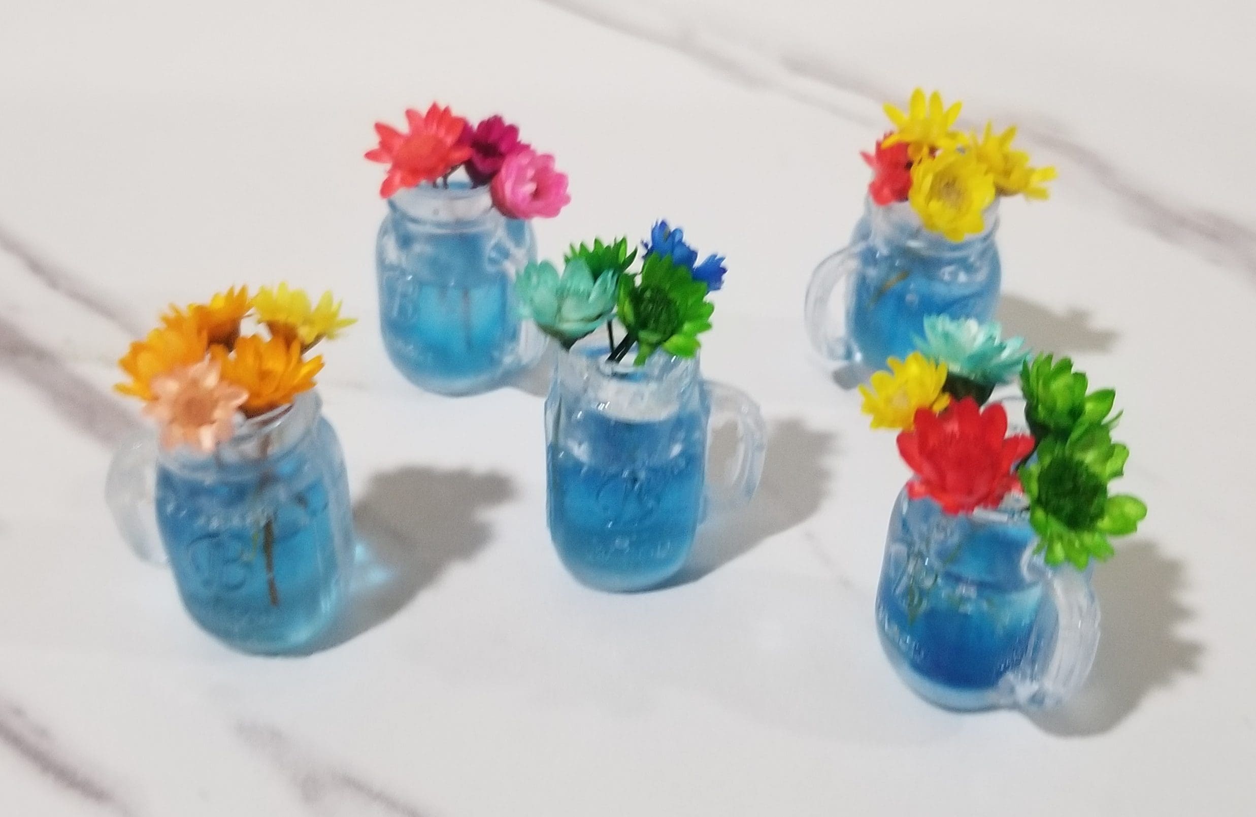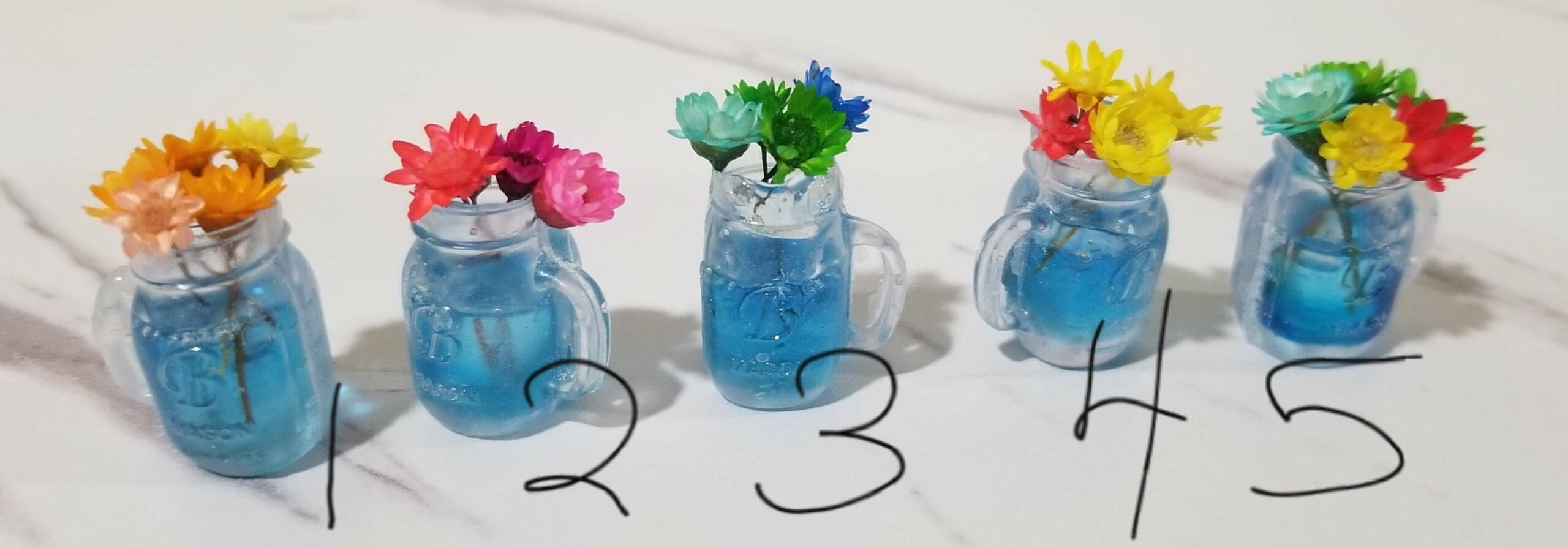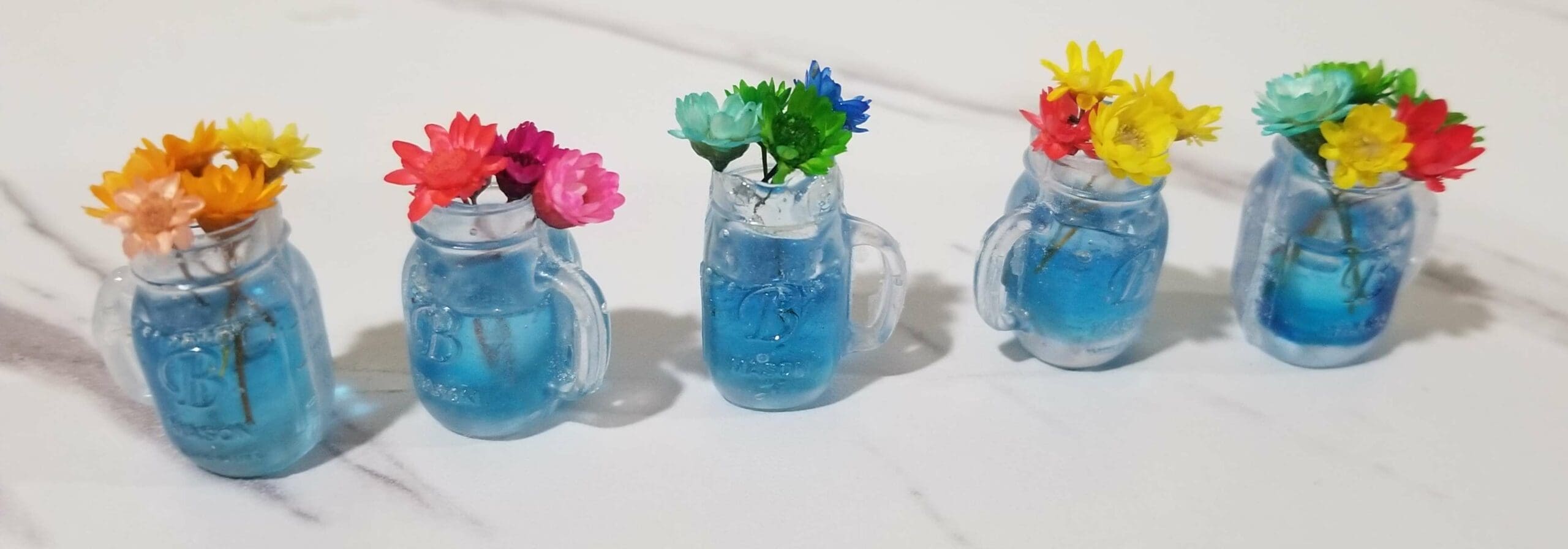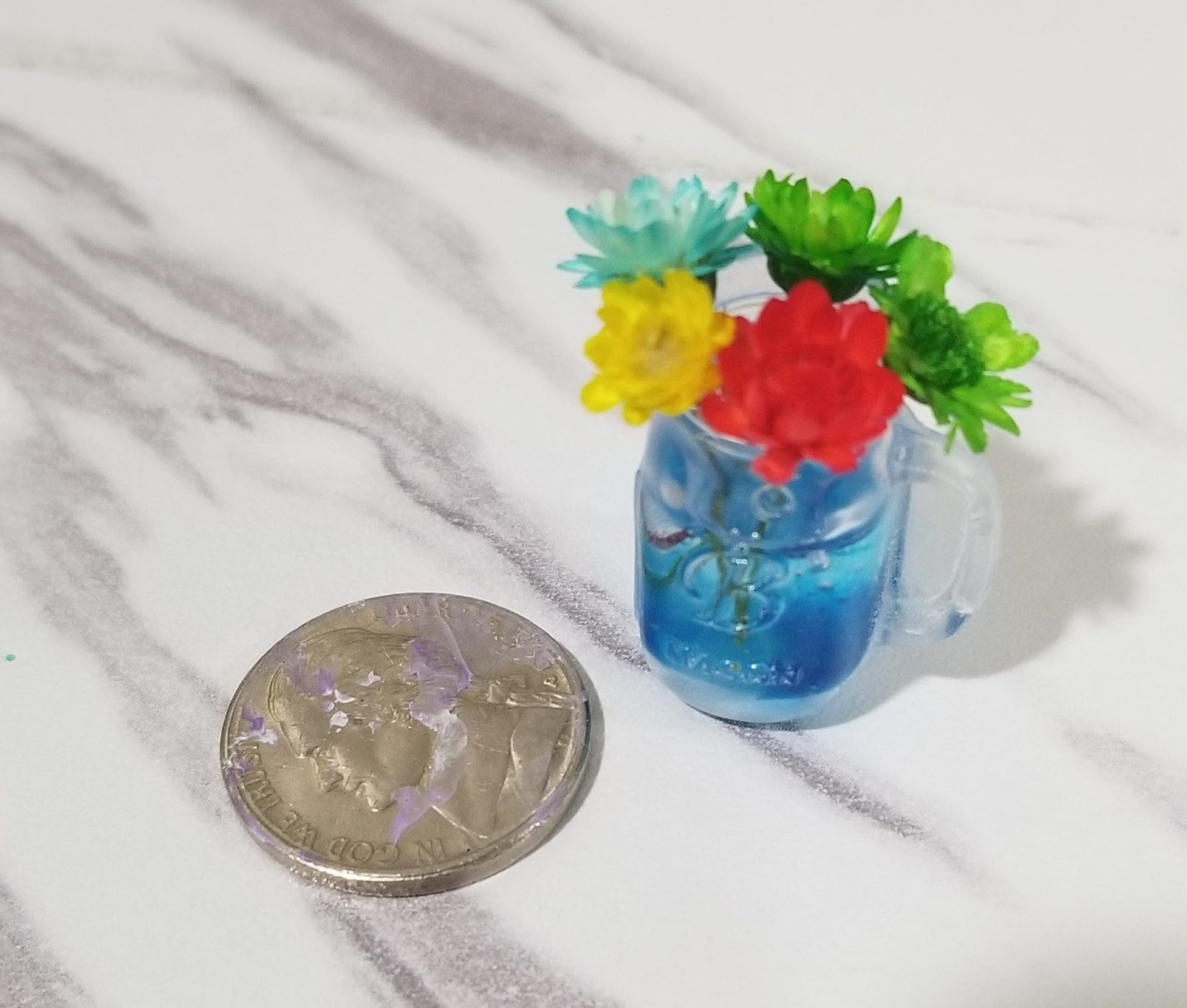 Adorable mini handled mason jar & filled with water are made entirely of UV resin. Mini dried flowers have been added for the bouquet effect. Perfect decor for your dollhouse, shadow box or next mini project.
