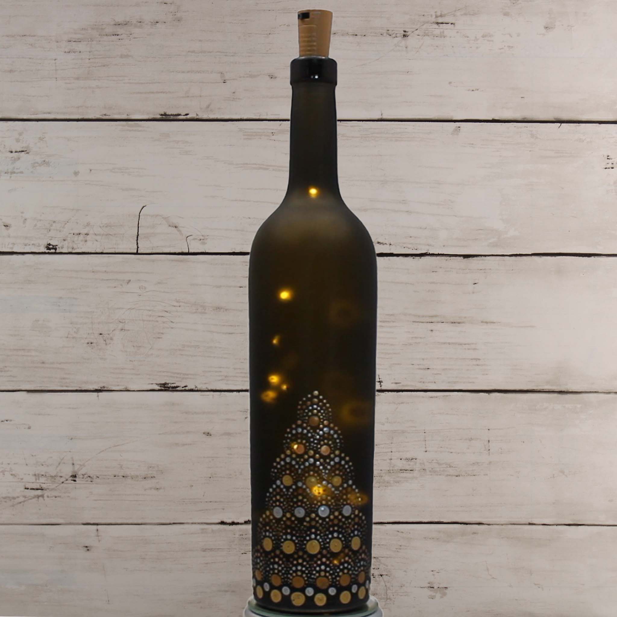 Discover a mesmerizing fusion of art and sustainability with this upcycled frosted green wine bottle. Its surface is adorned with a captivating pyramid design, meticulously hand-painted in shimmering metallic acrylic enamels. But the magic doesn’t end there. Hidden within its enchanting exterior is a string of warm, energy-efficient LED lights, transforming the bottle into a luminous masterpiece.