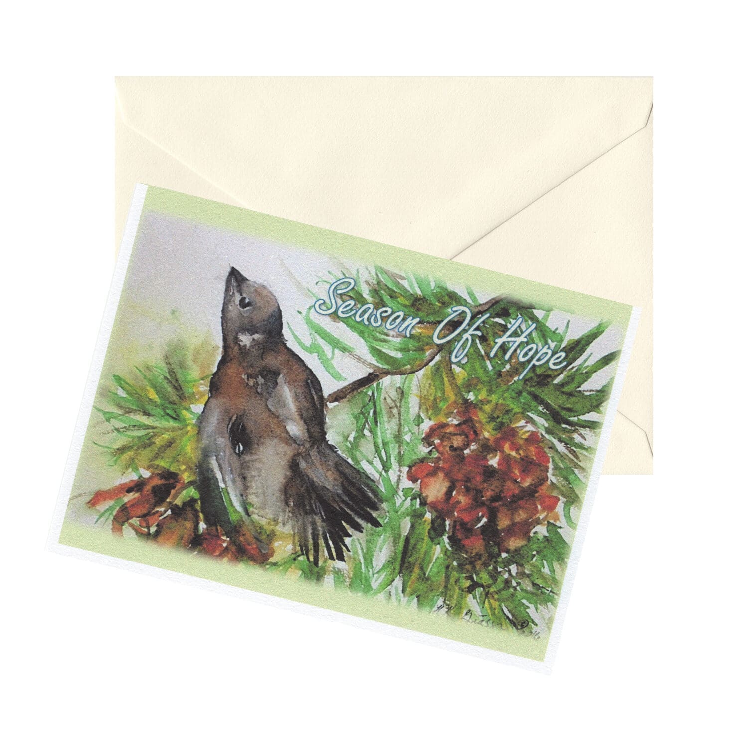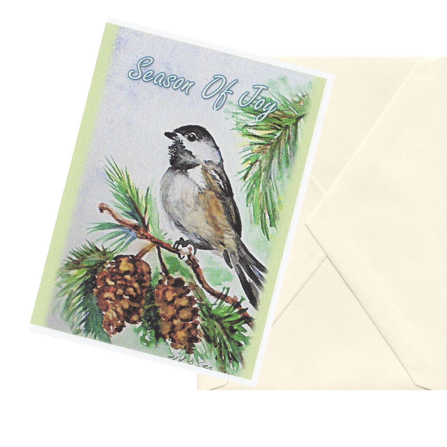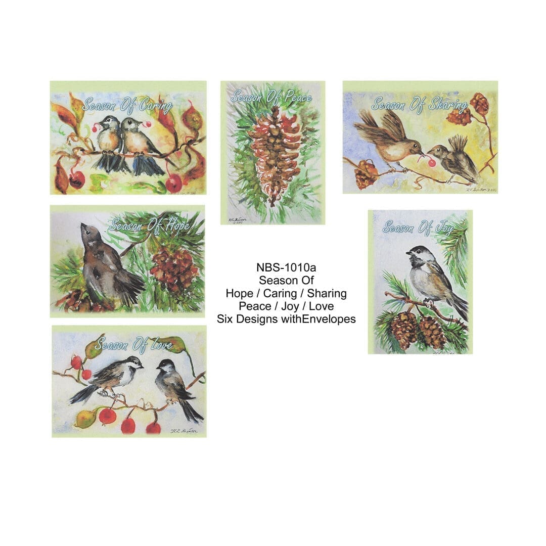 LIMITED STOCK ON CLEARANCE! This card is under a folded half-sheet in size. These cards are lightweight, with a pebbled matte finish, printed on 100 percent cotton paper. Experience the beauty of nature with our Modern Season of Watercolor Nature Art Greeting Card Set. These cards will inspire and delight, featuring stunning nature watercolor artwork of Pine Cones, Chickadees, and Sparrows in the garden. Perfect for sending heartfelt messages to your loved ones. Share the joy of nature with your friends and family through this six-card set!