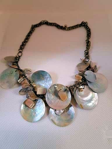 This 8″ bracelet is made with bronze chain, Mother of Pearl rounds and nuggets and freshwater pearls.
