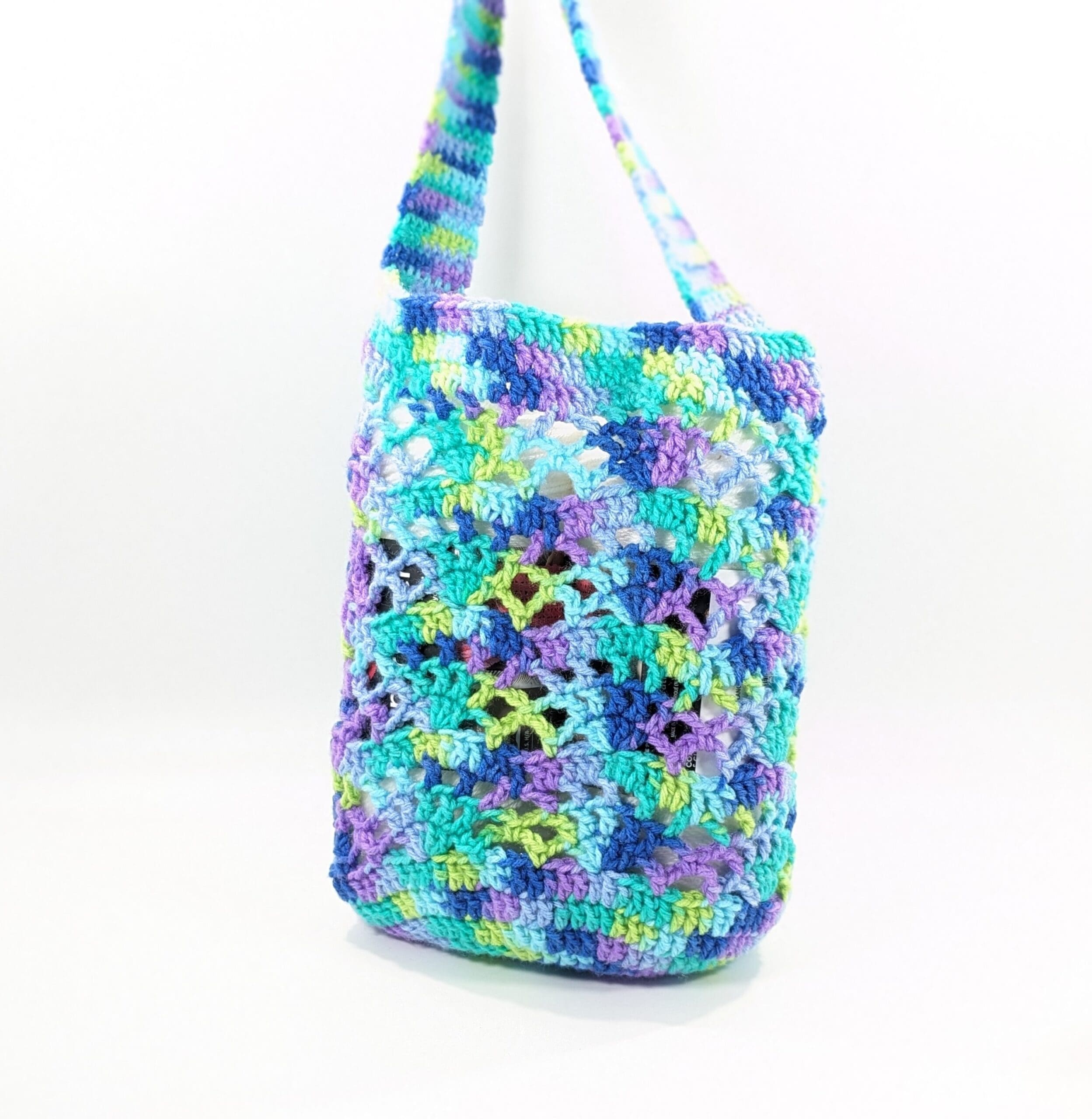 Also this Multi-Purpose Blue Shoulder Bag is crochet with 100% acrylic yarn. This bag measures 12 X 12 inches and has an 18 inch wide strap. The bottom measures 10 inches across. Also this bag will stretch some with heavy items, There are no seams so this bag will not rip open with normal use.