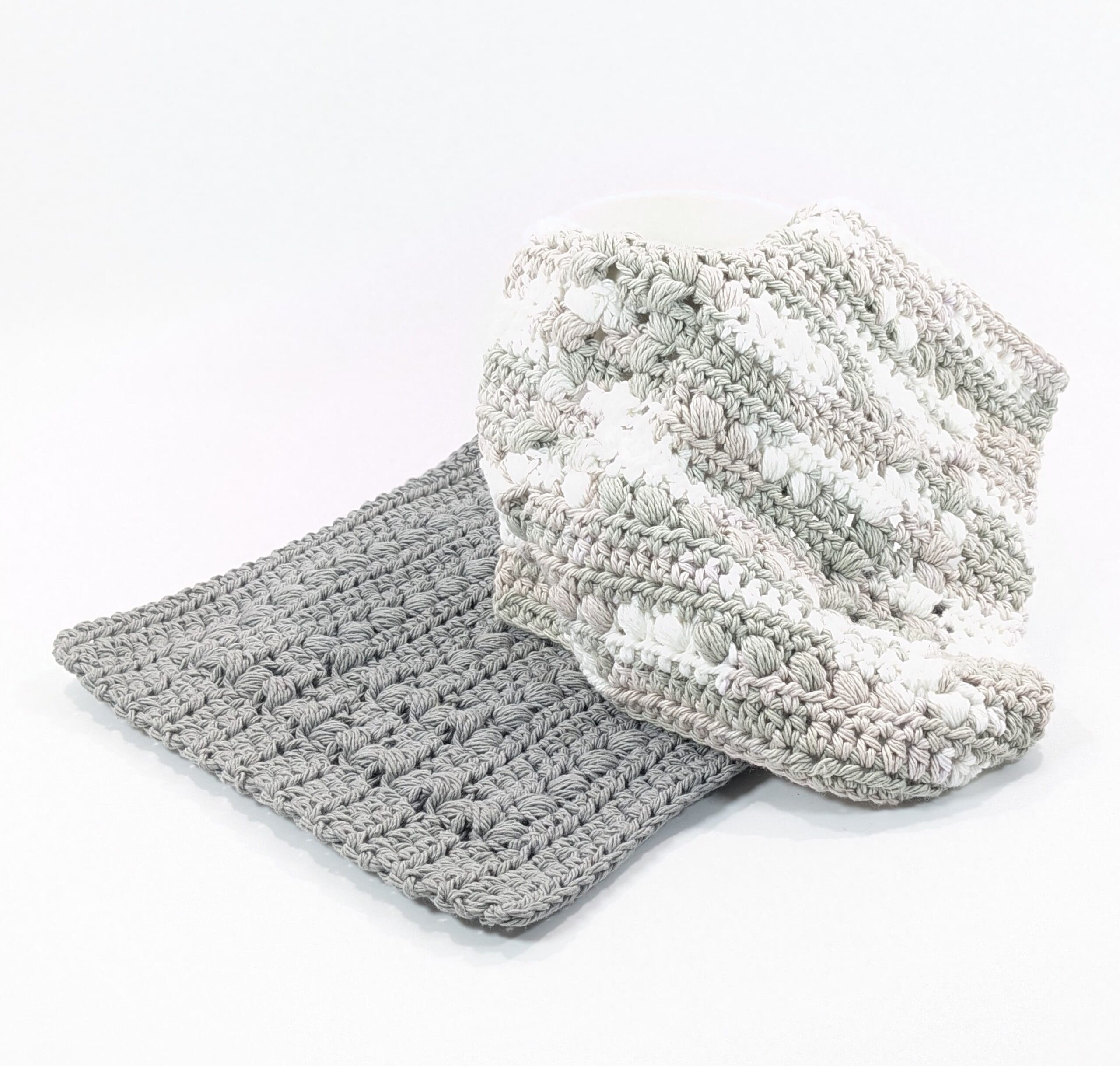 Multi-Purpose Crochet Grey Cloth Set. You get a set of two crochet cotton cleaning cloths. Use to wash dishes, pots and pans, table and counter tops. Also get a set to clean the bathroom tub, shower walls, sink and counter. Great for dusting and cleaning windows and mirrors. Asl get a set to clean your car inside and out.