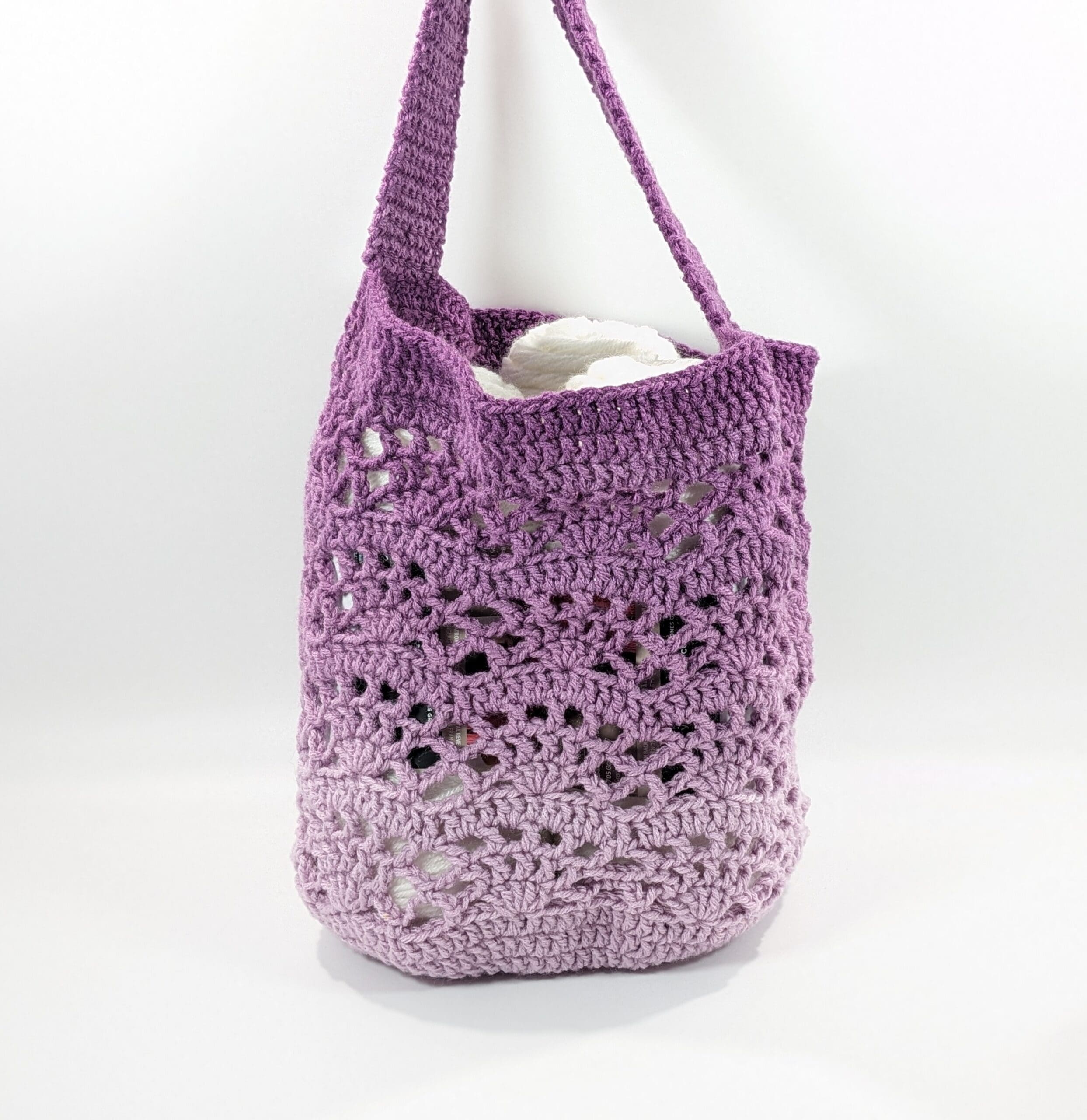 Also this Multi-Purpose Purple Crochet Bag is crochet with 100% acrylic yarn. This bag measures 12 X 12 inches and has an 18 inch wide strap. The bottom measures 10 inches across. Also this bag will stretch some with heavy items, There are no seams so this bag will not rip open with normal use.