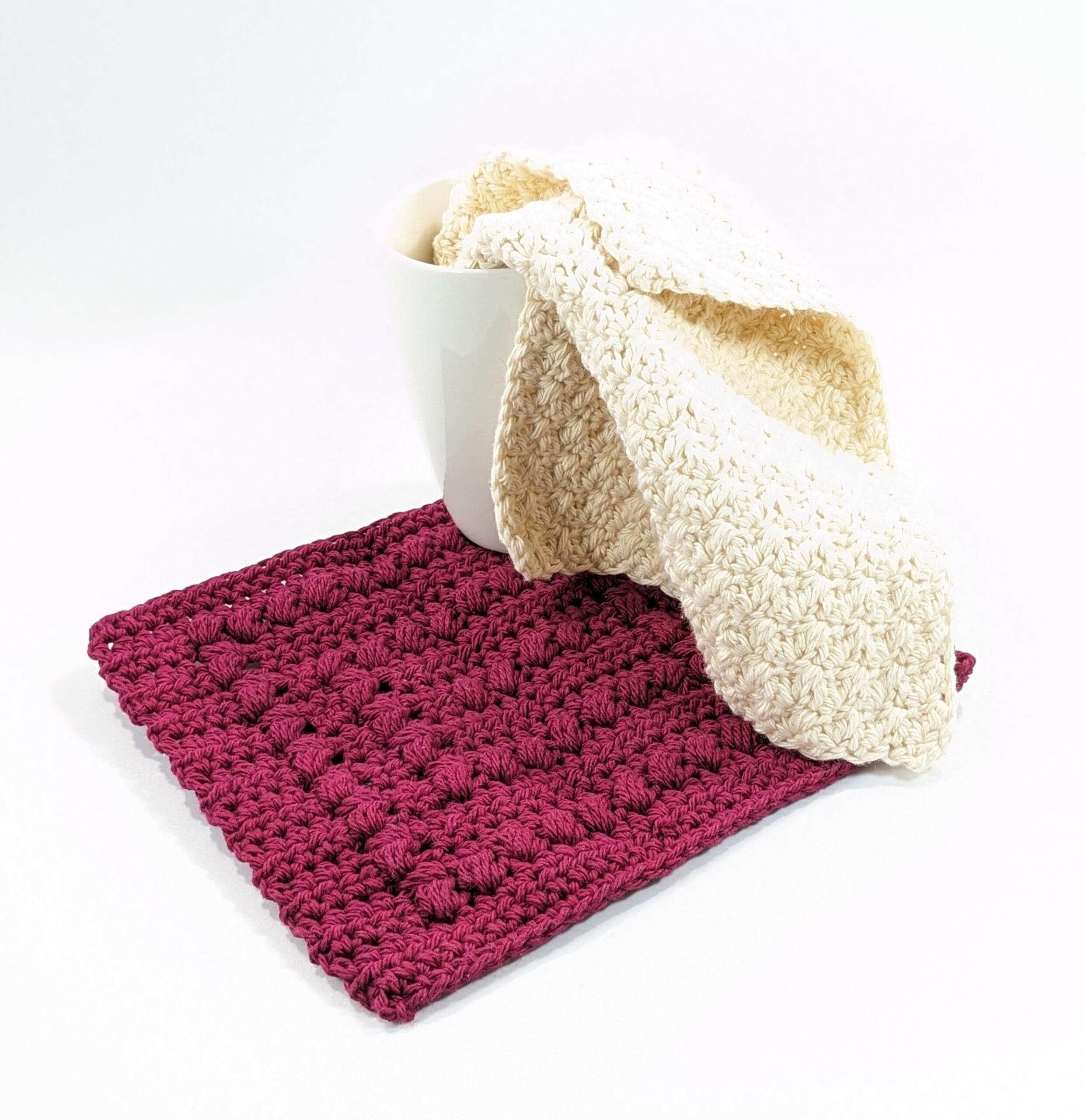 Multi-Purpose White & Burgundy Cloths. You get a set of two crochet cotton cleaning cloths. Use to clean your kitchen, dishes, counters, pots and pans. Also get a set to clean your bathroom tub, shower walls, sinks and counter. You can even use a set to clean windows and mirrors. Also great for cleaning the car inside and out.